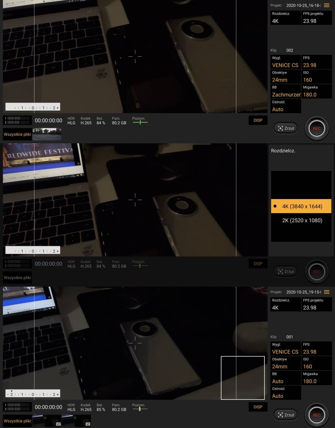 Równie szerokie możliwości oferuje aplikacja Cinema Pro. Mamy do wyboru różne filtry obrazu i efekty kolorystyczne, zmianę liczby rejestrowanych klatek, rozdzielczość, typ pomiaru ostrości… Dużo bym dał żeby obie aplikacje pojawiły się w Google Play z możliwością pobrania na inne smartfony.