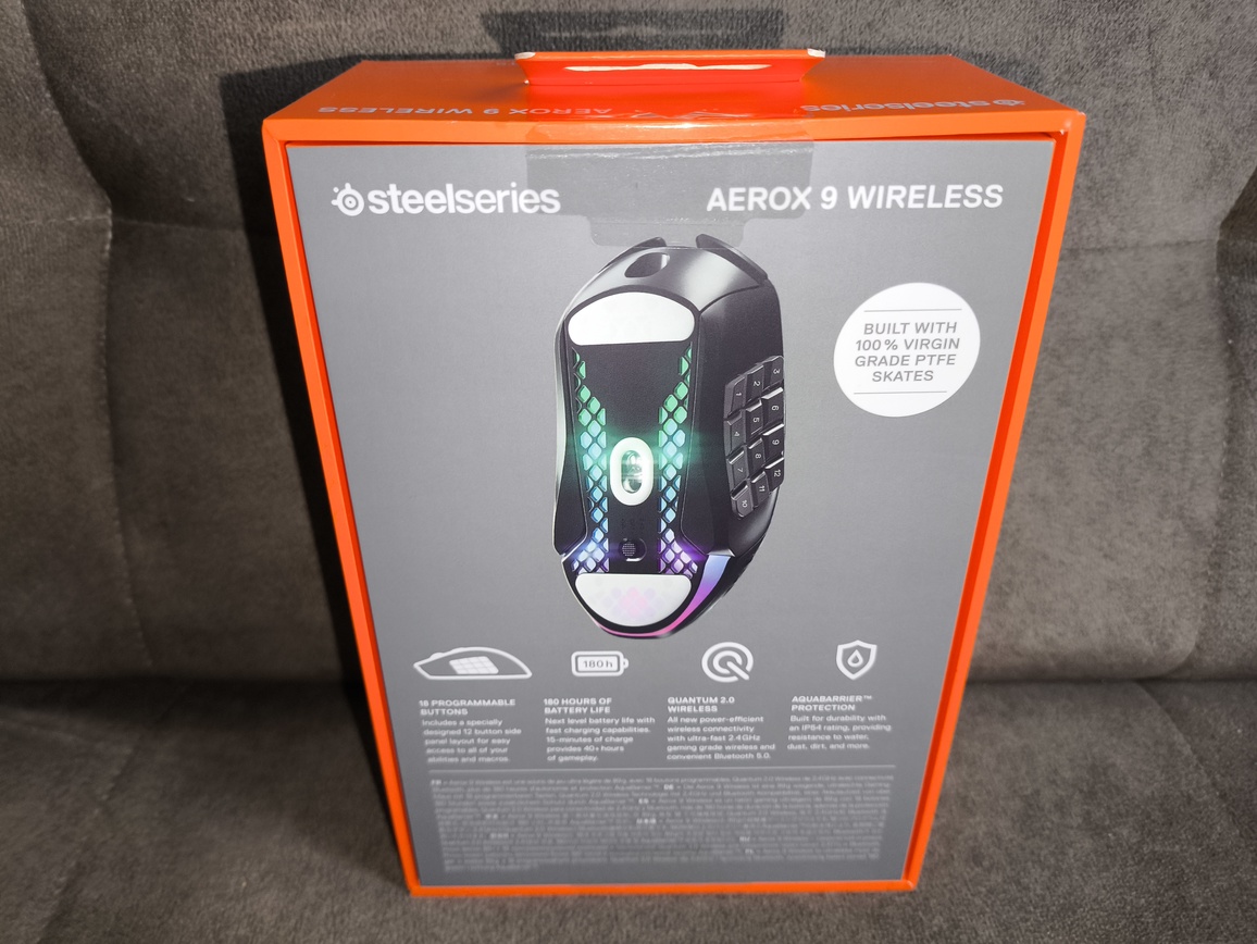 SteelSeries Aerox 9 Wireless to mysz bezprzewodowa klasy MMO, będąca rozwinięciem linii Aerox, znanej z lekkiej konstrukcji i charakterystycznego, perforowanego wzornictwa. Producent zdecydował się w tym modelu na radykalne zwiększenie funkcjonalności względem klasycznych myszy gamingowych, implementując rozbudowany panel 12 przycisków bocznych, który ma w pełni odpowiadać wymaganiom graczy MMO i MOBA.