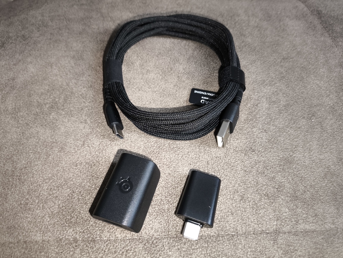 Przewód może pełnić również funkcję przedłużacza dla odbiornika bezprzewodowego, jeśli wykorzystamy dołączony extender. Rozwiązanie to pozwala skrócić dystans między myszą a nadajnikiem 2.4 GHz, co może pozytywnie wpłynąć na stabilność połączenia. Sam extender sprawdza się także jako praktyczne miejsce do „przechowywania” odbiornika – szczególnie że SteelSeries Aerox 9 Wireless nie posiada dedykowanego schowka na dongle. Warto jednak zaznaczyć, że sam odbiornik jest stosunkowo duży, więc ryzyko jego zgubienia i tak pozostaje niewielkie.