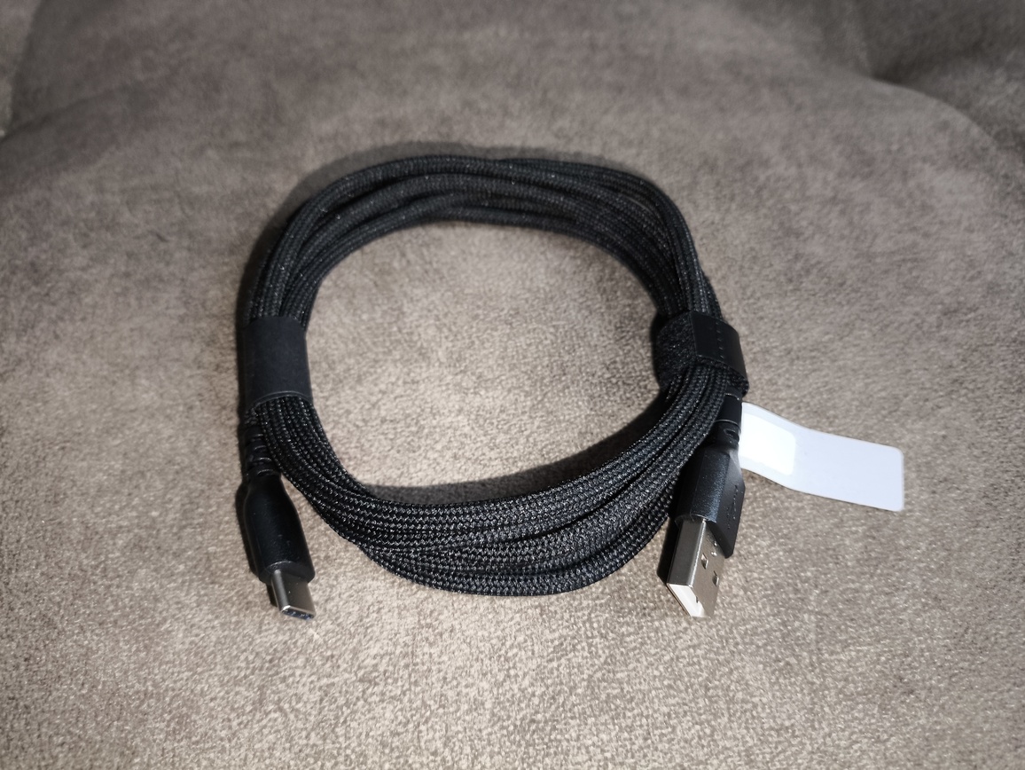 Oprócz łączności bezprzewodowej mysz SteelSeries Aerox 9 Wireless została wyposażona w klasyczny przewód USB typu A do USB typu C w oplocie przypominającym paracord. Jest on stosunkowo miękki i elastyczny, choć nieco ustępuje pod tym względem kablom stosowanym przez ASUS ROG czy Glorious. Mimo to wypada wyraźnie lepiej niż przewód znany z Razer DeathAdder V2 Pro, dzięki czemu w praktyce mysz może być używana w trybie przewodowym niemal tak komfortowo, jak klasyczna konstrukcja bezprzewodowa – bez wyraźnego wpływu kabla na prowadzenie. Całkowita długość przewodu wynosi około 2.05 metra.