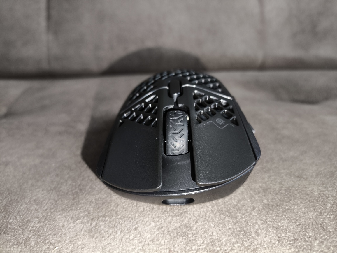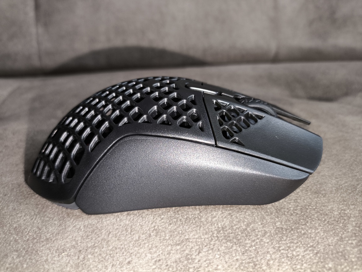 Nie da się jednak pominąć faktu, że na tle współczesnych konstrukcji typu lightweight model ten wypada dość masywnie. Choć ergonomia stoi na wysokim poziomie i sam kształt bardzo dobrze leży w dłoni, to wymaga on chwili przyzwyczajenia – szczególnie ze względu na perforowane przyciski, wyraźnie zaznaczony garb oraz rozbudowany panel boczny. Największym wyzwaniem okazała się jednak masa, która jest wyraźnie odczuwalna podczas dynamicznych ruchów.