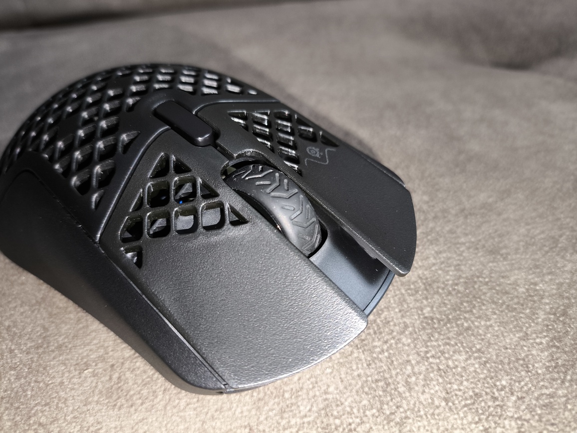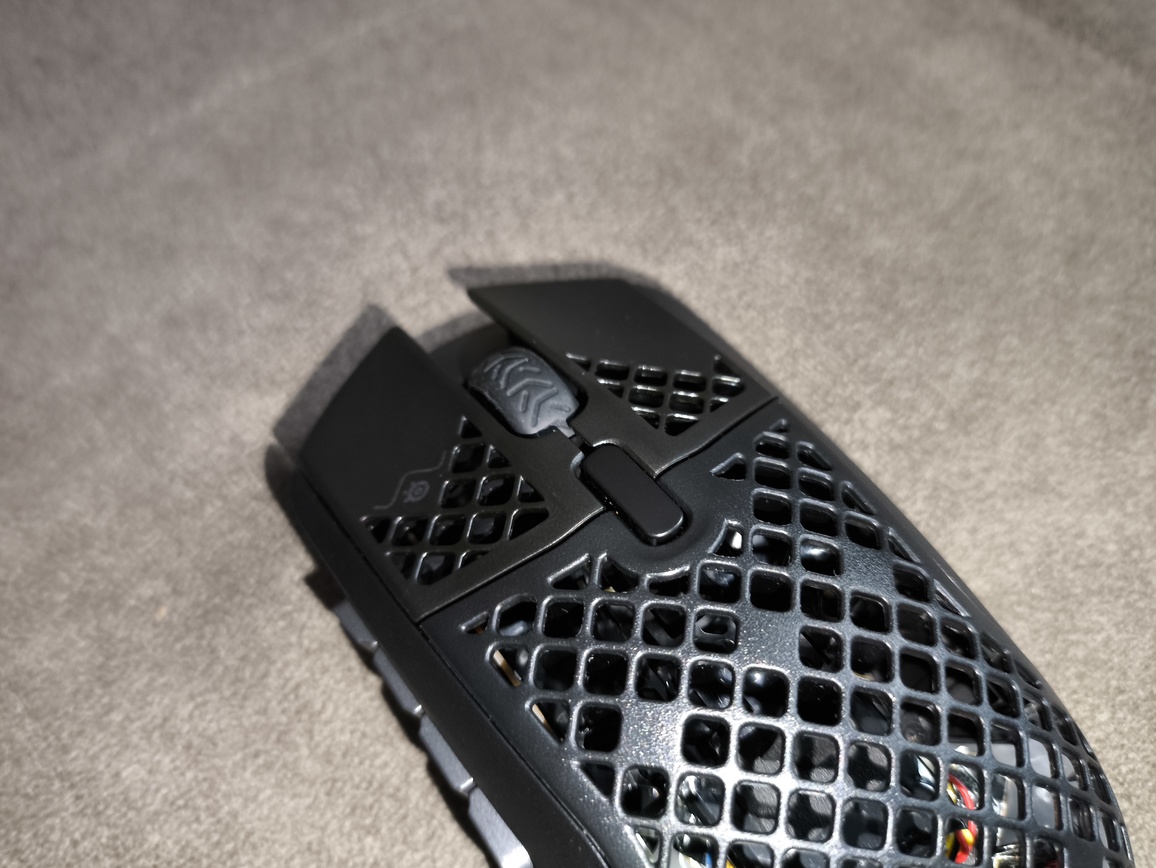 Główne przyciski w SteelSeries Aerox 9 Wireless prezentują bardzo dobry poziom wykonania. Klik jest lekki, sprężysty i wyraźnie responsywny, co przekłada się na wysoką precyzję podczas użytkowania. Występuje niewielki pre-travel na prawym przycisku oraz bardziej zauważalny post-travel w obu, jednak w praktyce nie wpływa to negatywnie na odbiór – całość nadal sprawia bardzo dobre wrażenie.