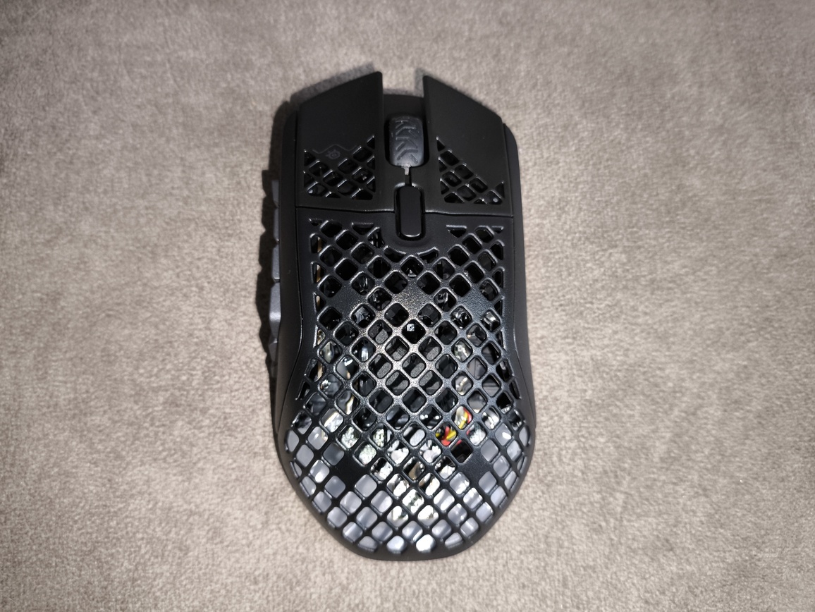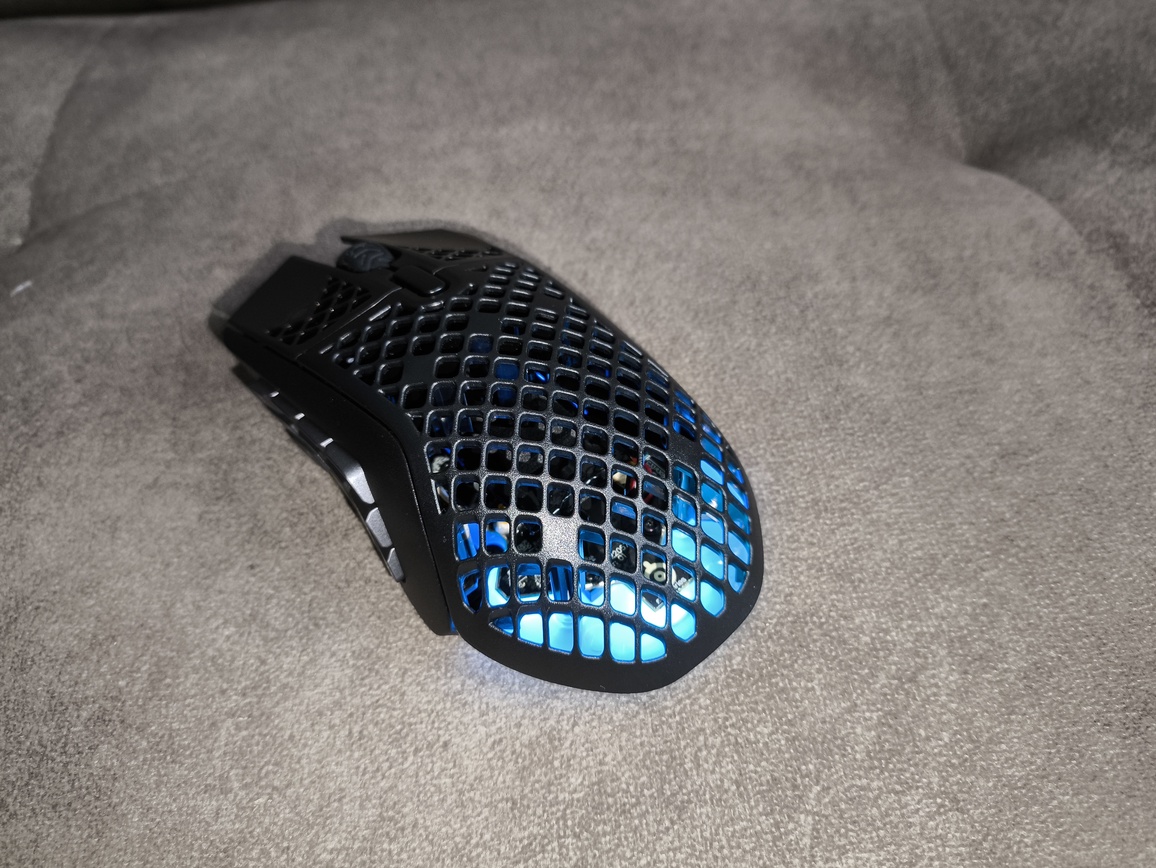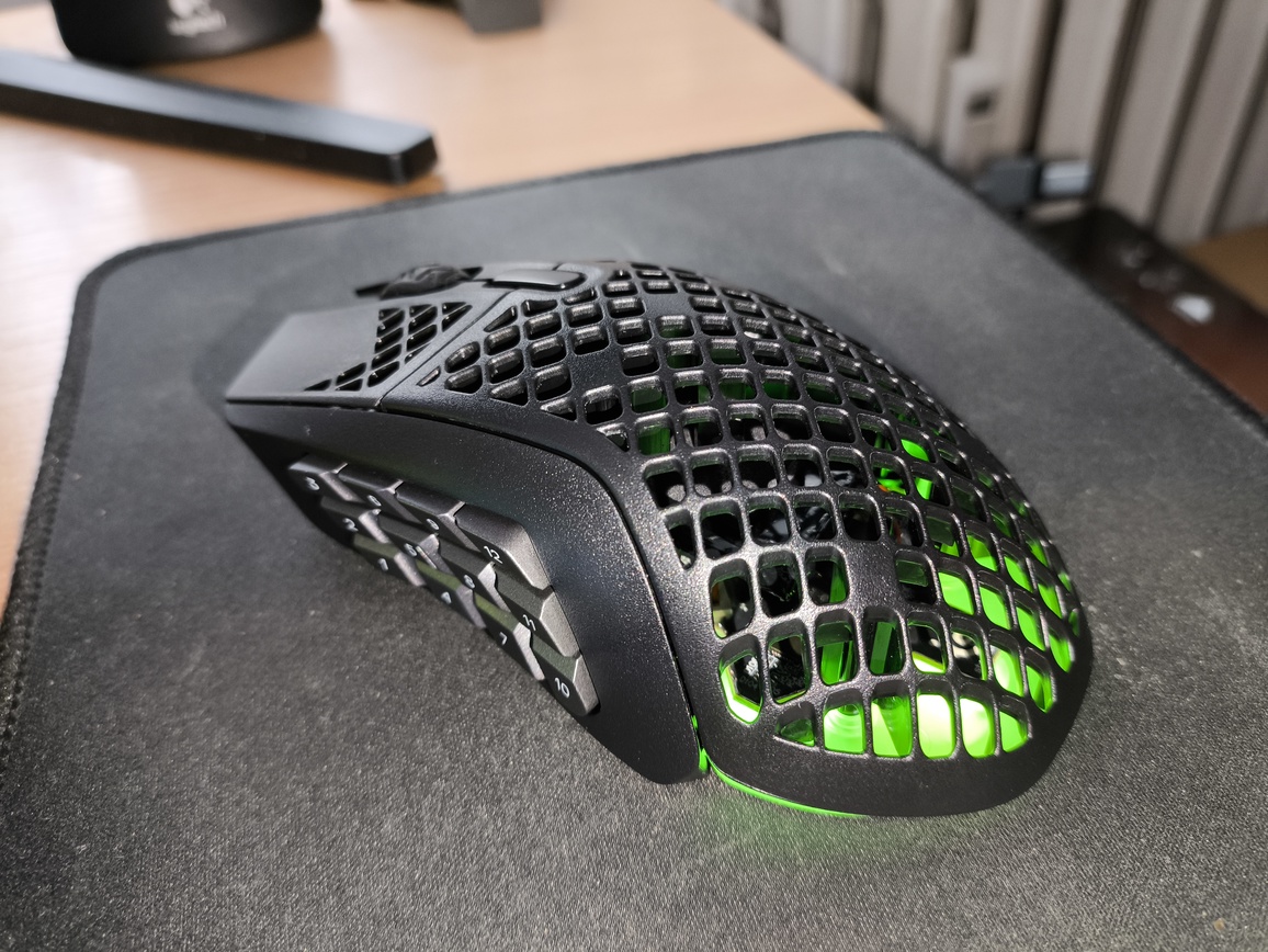 SteelSeries Aerox 9 Wireless wyróżnia się charakterystyczną konstrukcją typu plaster miodu, która pozwoliła znacząco obniżyć masę urządzenia. Całość waży 89 gramów, co należy uznać za dobry wynik, choć wciąż nie jest to najlżejsza mysz na rynku. W praktyce ciężar jest wyczuwalny w dłoni, ale trudno uznać to za wadę – szczególnie biorąc pod uwagę rozbudowany panel boczny z 12 przyciskami.