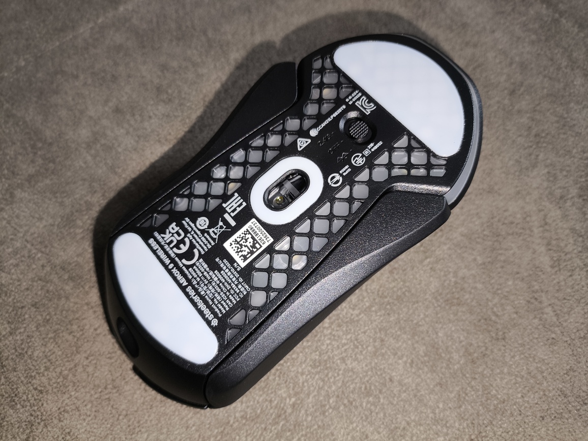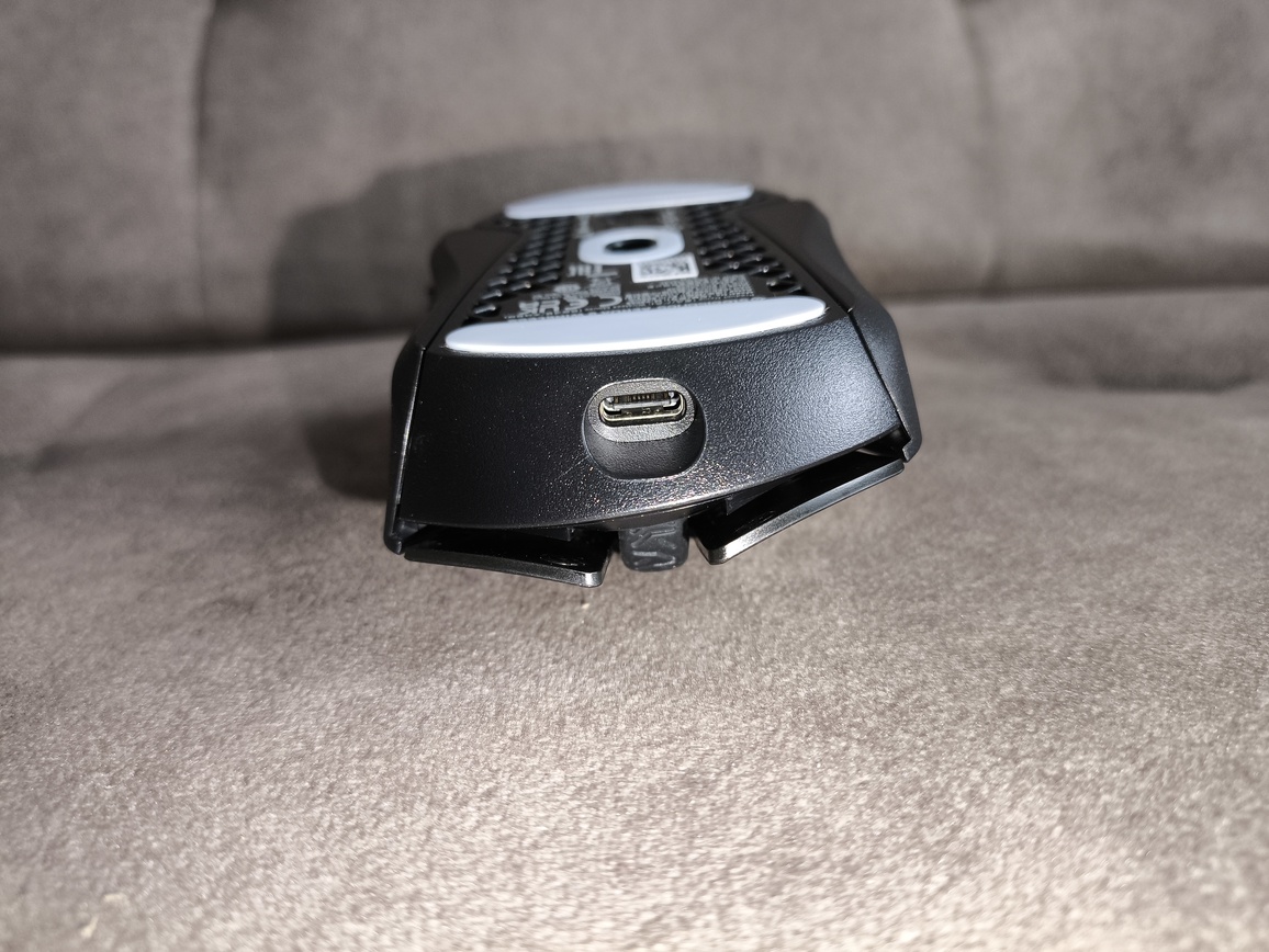 Spód myszy został zaprojektowany poprawnie i bez zbędnych udziwnień. Znajdziemy tu przełącznik trybów pracy (2.4 GHz / Bluetooth / OFF), który działa pewnie i bezproblemowo. Całość konstrukcji jest dobrze spasowana – nie występują luzy ani niepożądane odgłosy przy normalnym użytkowaniu.