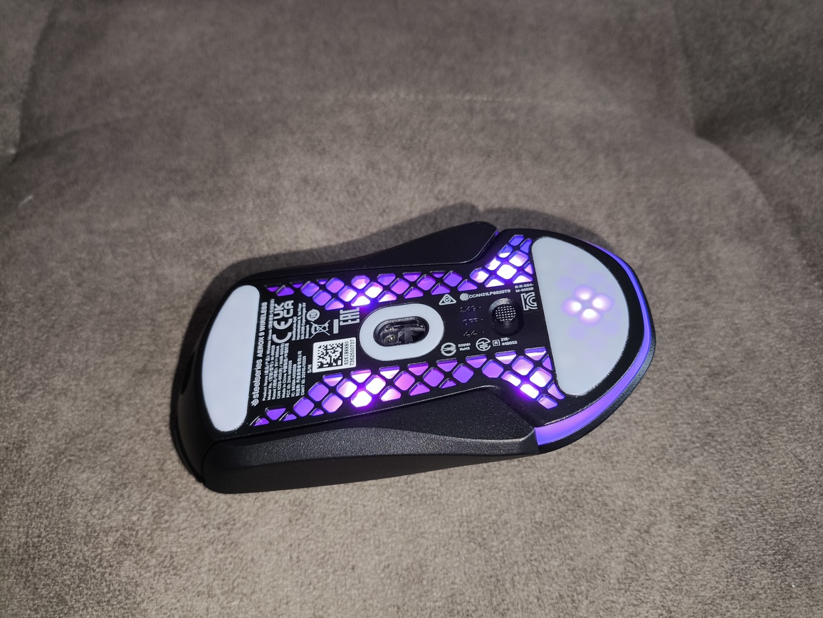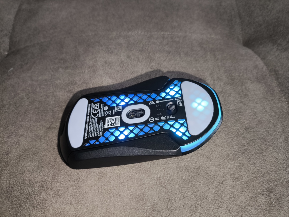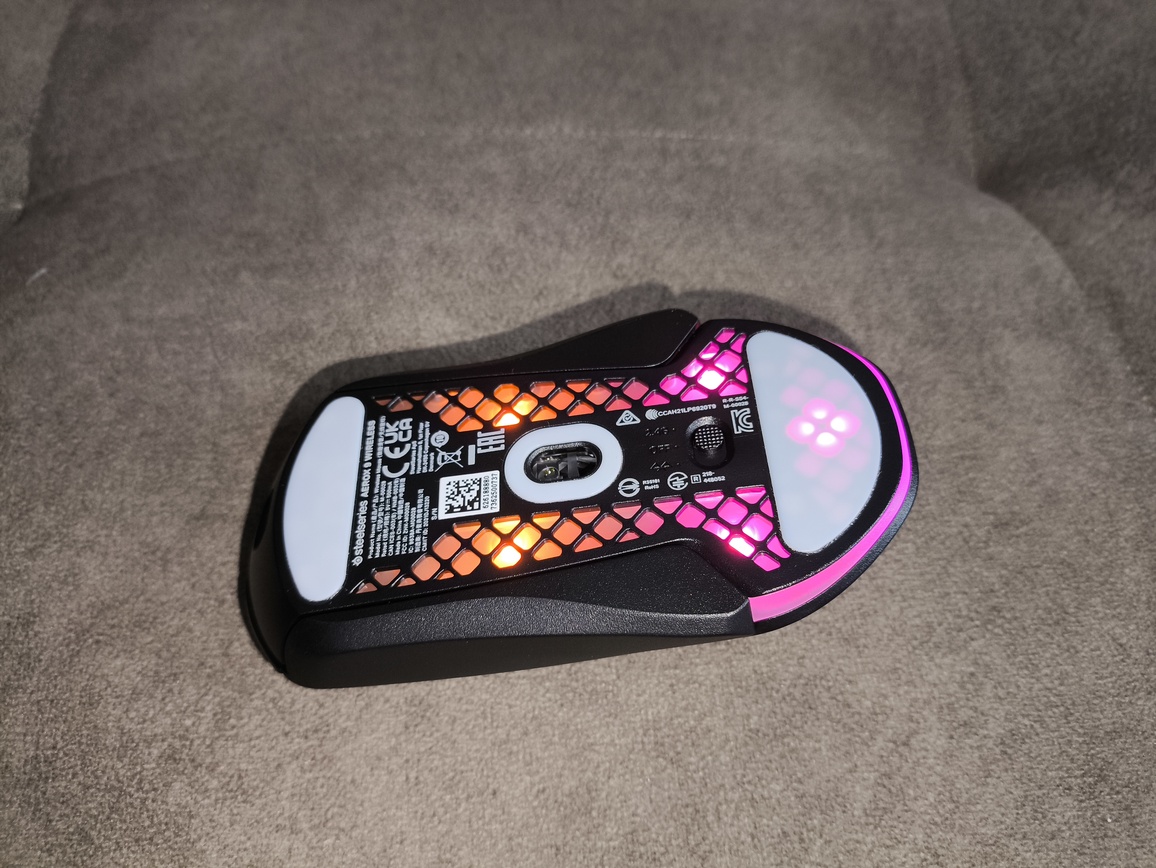 Mysz SteelSeries Aerox 9 Wireless została wyposażona w podświetlenie PrismSync, które efektownie prześwituje przez perforowaną, plasterkową konstrukcję obudowy, a dodatkowo widoczne jest również na spodzie oraz w tylnej części w formie charakterystycznego łuku. System oferuje trzy strefy podświetlenia z paletą 16.8 miliona kolorów i może być łatwo synchronizowany z innymi urządzeniami SteelSeries.