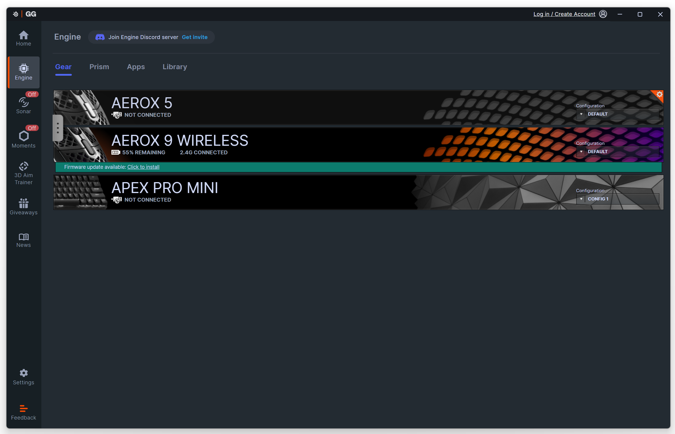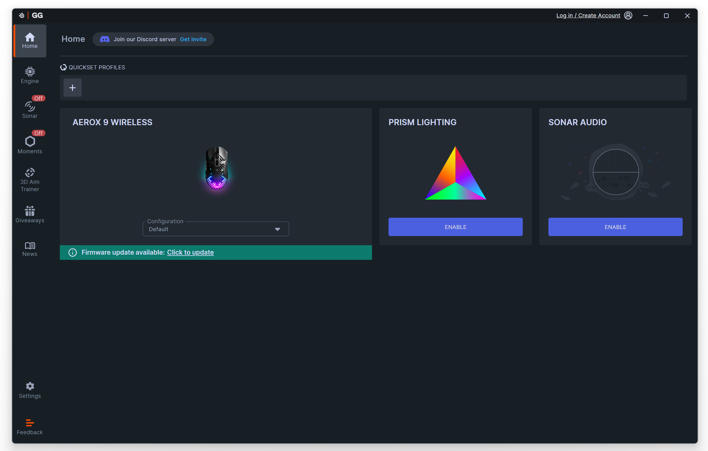 Oprogramowanie SteelSeries GG stanowi obecnie rozbudowaną platformę, w której zintegrowano dawny moduł SteelSeries Engine. Oprócz niego znajdziemy tu również dodatkowe funkcje, takie jak Moments czy Sonar. Warto jednak podkreślić, że sam Engine – kluczowy z punktu widzenia konfiguracji myszy SteelSeries Aerox 9 Wireless – może być używany bez konieczności zakładania konta, o ile pominiemy ten etap podczas pierwszego uruchomienia.