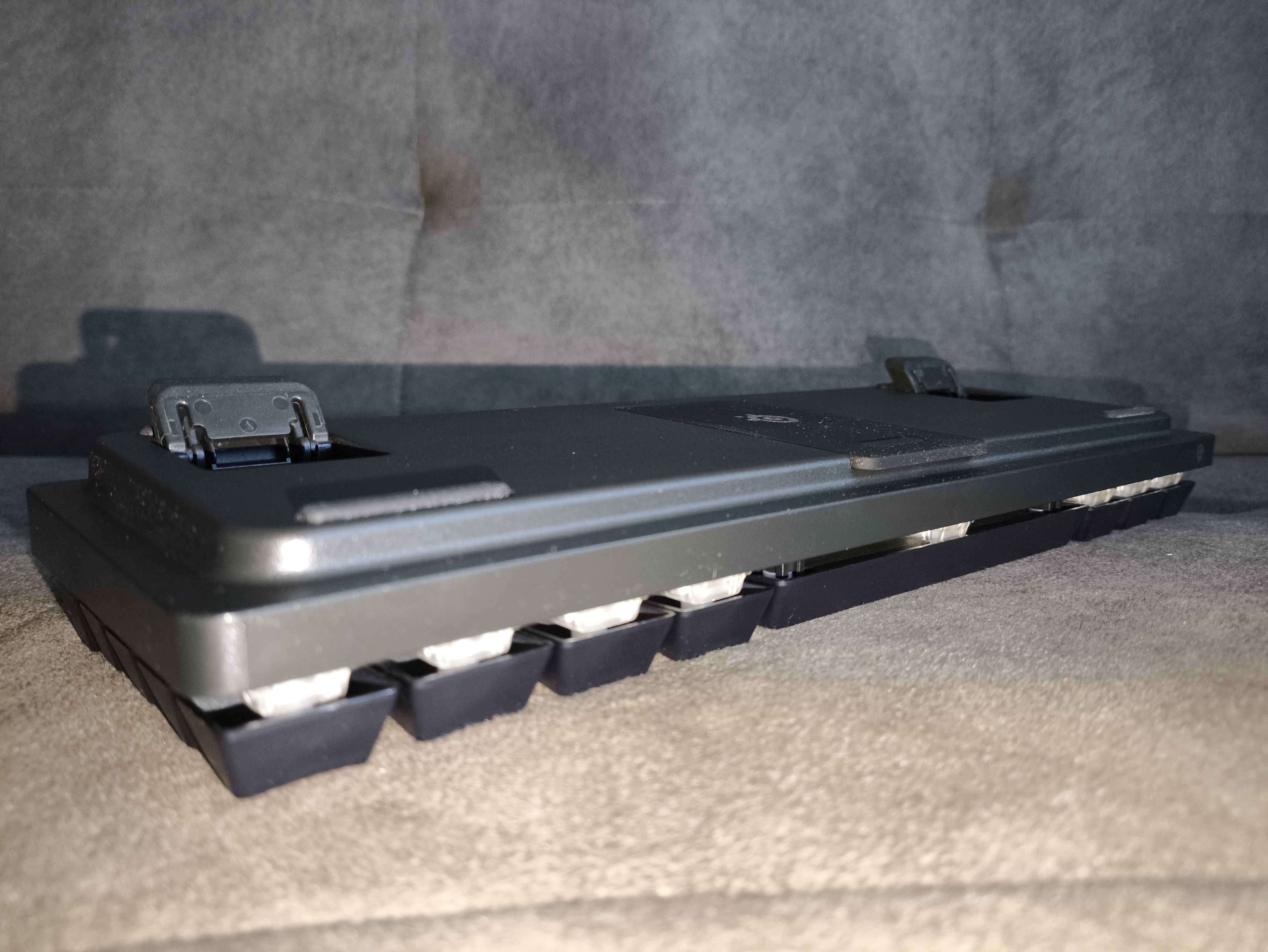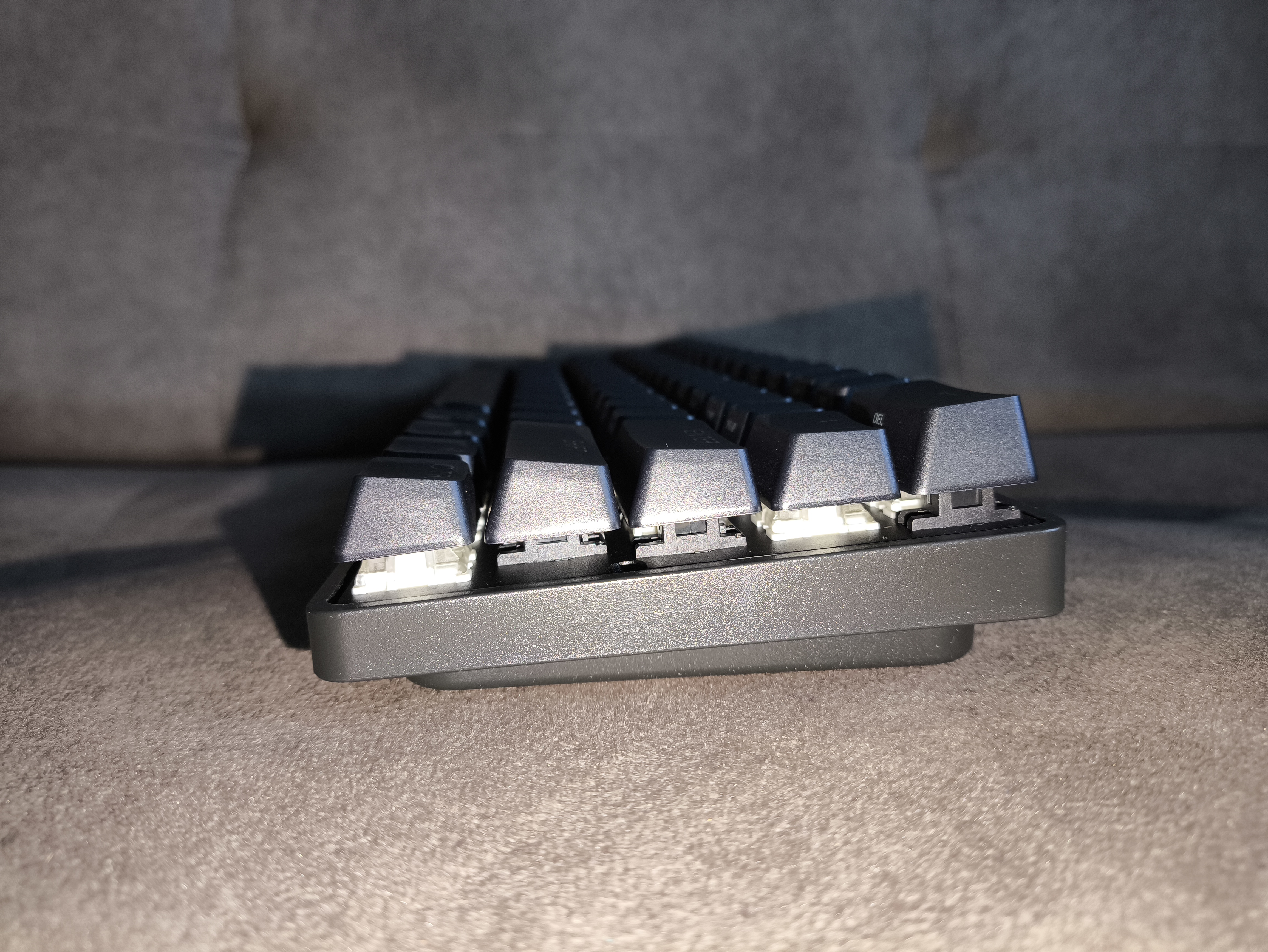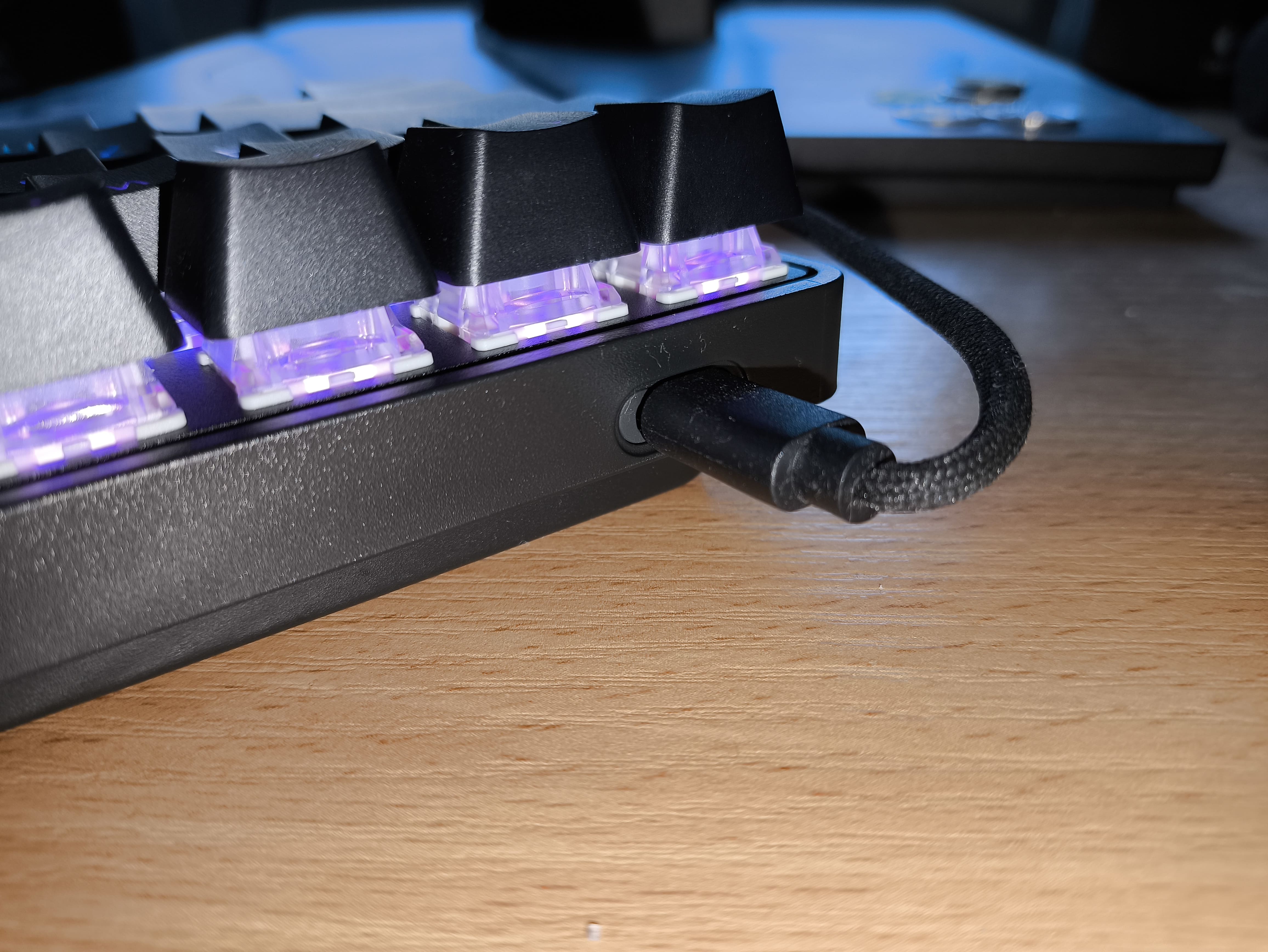 Klawiatura w testowanej wersji nie oferuje łączności bezprzewodowej: Bluetooth’a lub 2.4 GHz za pomocą dołączonego dongla. Wejście USB-C w klawiaturze, zostało umiejscowione w lewym rogu tylnej części.