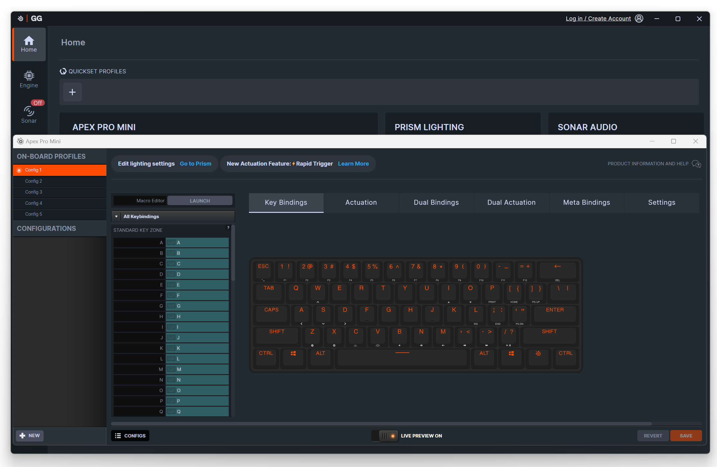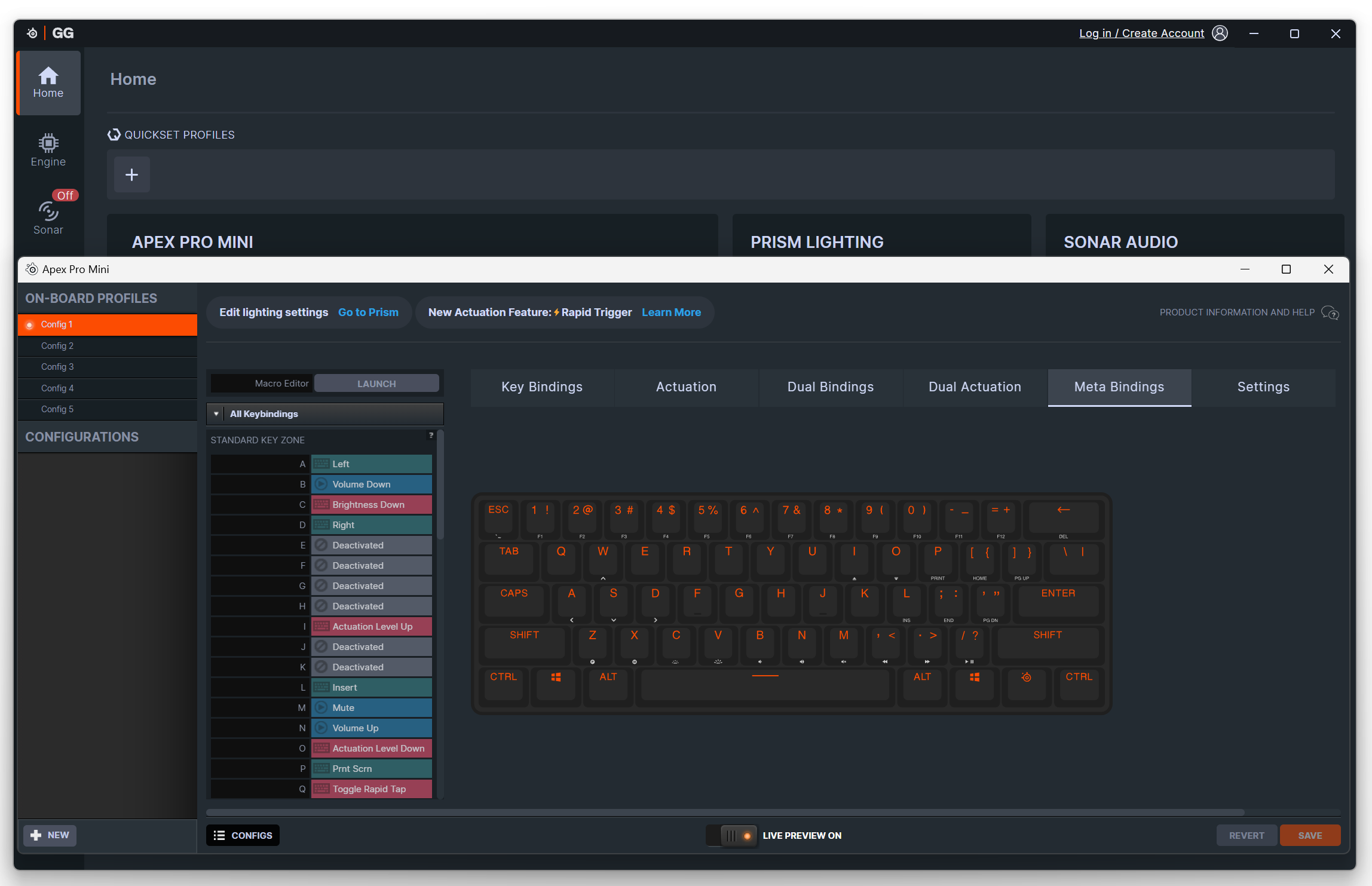 - sterowanie onboard: Poprzez przytrzymanie klawisza funkcji (z logo SteelSeries) można uzyskać dostęp do Meta Layer, co pozwala na szybkie przełączanie profili oraz podstawową regulację ustawień bez aplikacji.