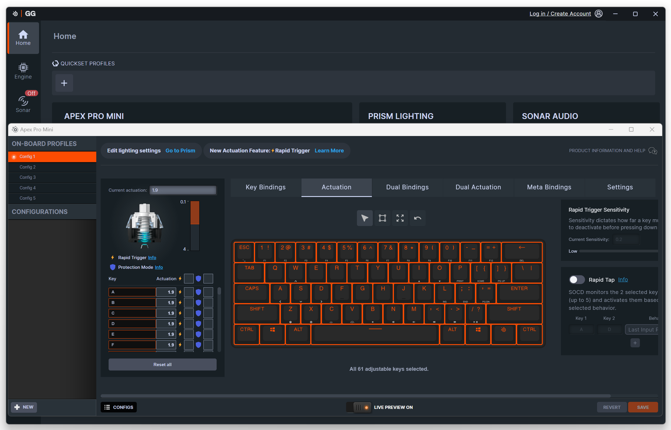 - profile: Klawiatura może przechowywać pięć w pełni konfigurowalnych profili w pamięci wewnętrznej (onboard memory). Profile można dostosować pod kątem ustawień aktywacji, makr i schematów kolorów.