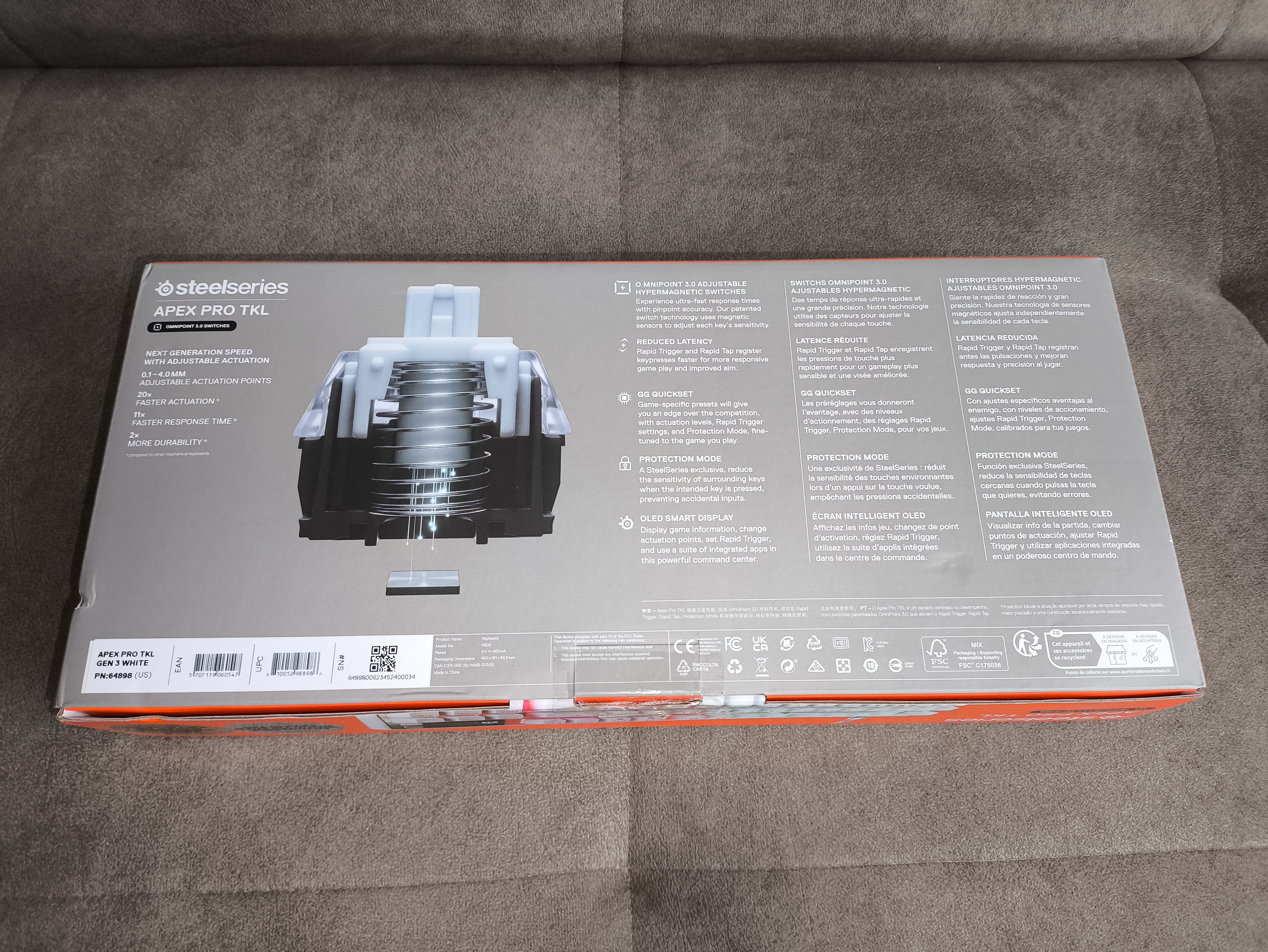 Ważacy 1403 gram SteelSeries Apex Pro Gen 3 TKL trafia do użytkownika w typowym dla producenta kartonie utrzymanym w biało-pomarańczowej stylistyce, dobrze znanej z poprzednich generacji urządzeń. Front opakowania w dużej części zajmuje zdjęcie klawiatury z wyeksponowanym podświetleniem RGB, natomiast boki i tył zawierają szczegółowe informacje techniczne oraz najważniejsze cechy urządzenia – od zastosowanych przełączników OmniPoint 3.0, po obsługę SteelSeries GG Engine i funkcje gamingowe. Całość prezentuje się profesjonalnie i estetycznie, a karton dzięki solidnej konstrukcji dobrze chroni zawartość w czasie transportu.