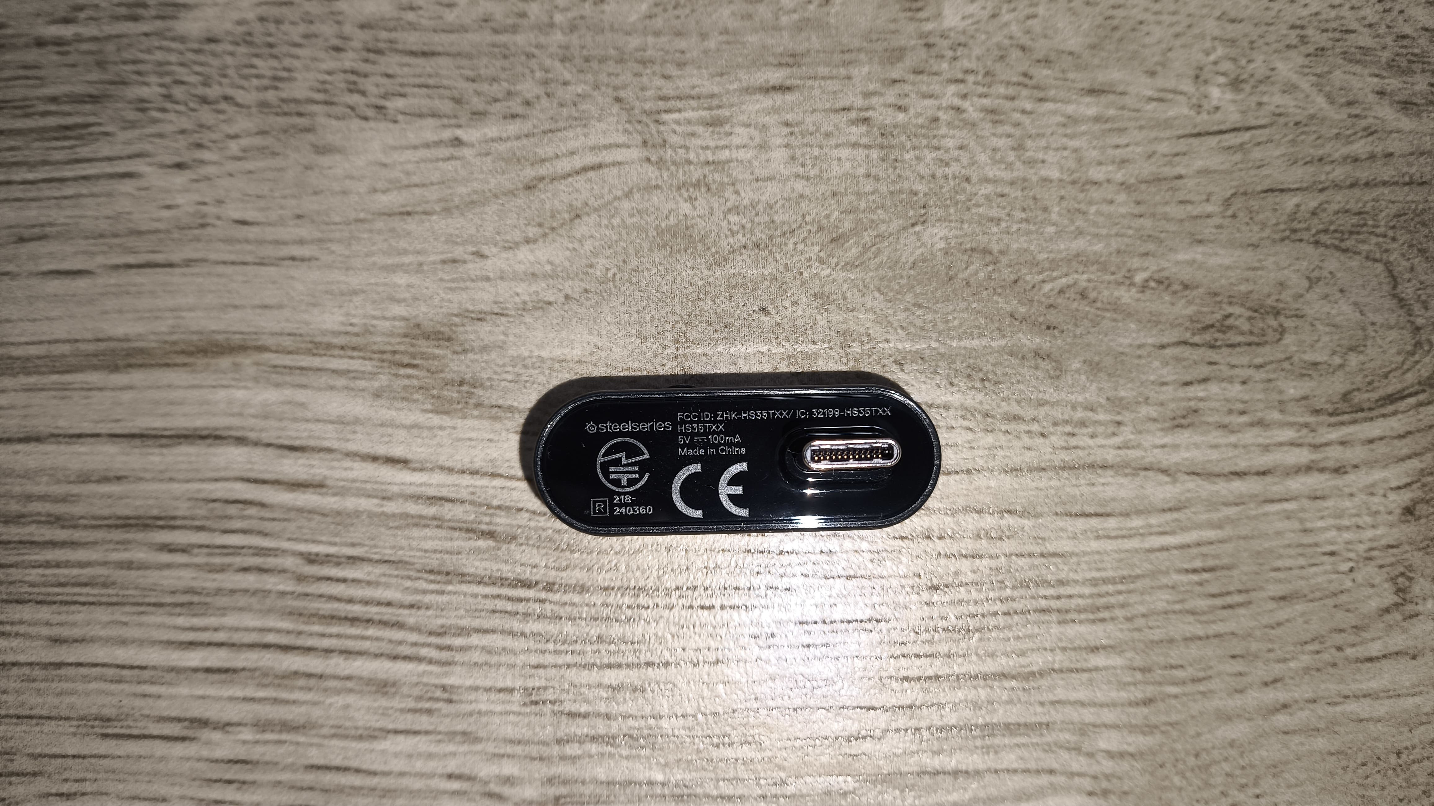Wiele słuchawek TWS dla graczy nie oferuje takiego zintegrowanego schowka. Adapter wygląda jak czarny prostokącik przypominający kształtem pastylkę Pez, z wtykiem USB-C wystającym od spodu po prawej stronie. Znajduje się na nim także przycisk parowania.