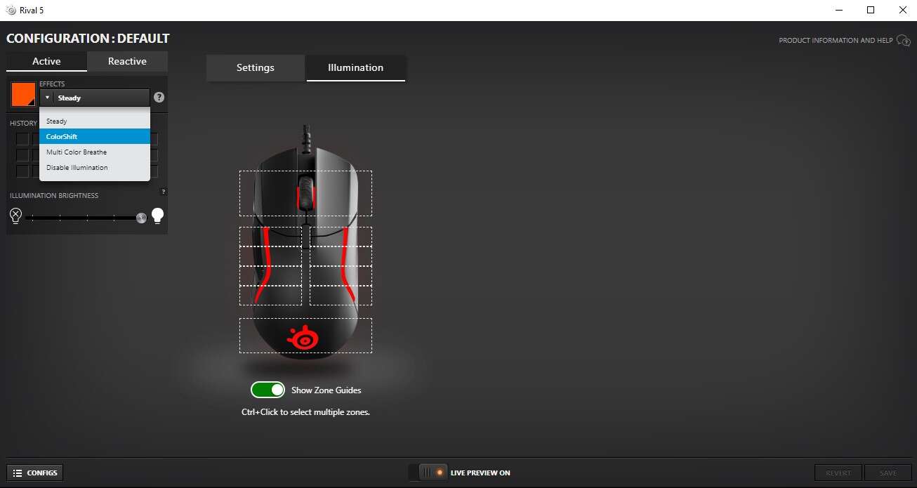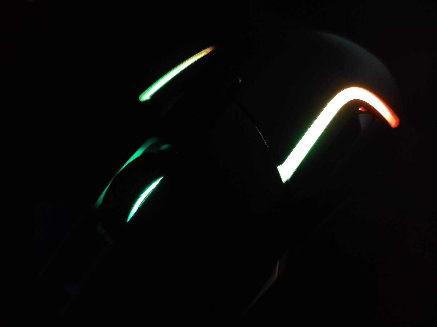 Kultowe wręcz dla SteelSeries podświetlenie, które za każdym razem robi niemałe wrażenie, trafiło również na pokład Rival 5, obejmując 10 niezależnych od siebie nawzajem stref diod, które podświetlają rolkę, dwa rozciągające się po korpusie grube „wężyki” oraz samo logo producenta na grzbiecie. W oprogramowaniu możemy nie tylko wybrać podświetlenie dla każdej ze stref, ale też ustawić efekt ciągle świecący (wielokolorowe oddychanie, tryb stały, płynna zmiana kolorów) razem z jednoczesną reakcją na klikanie.