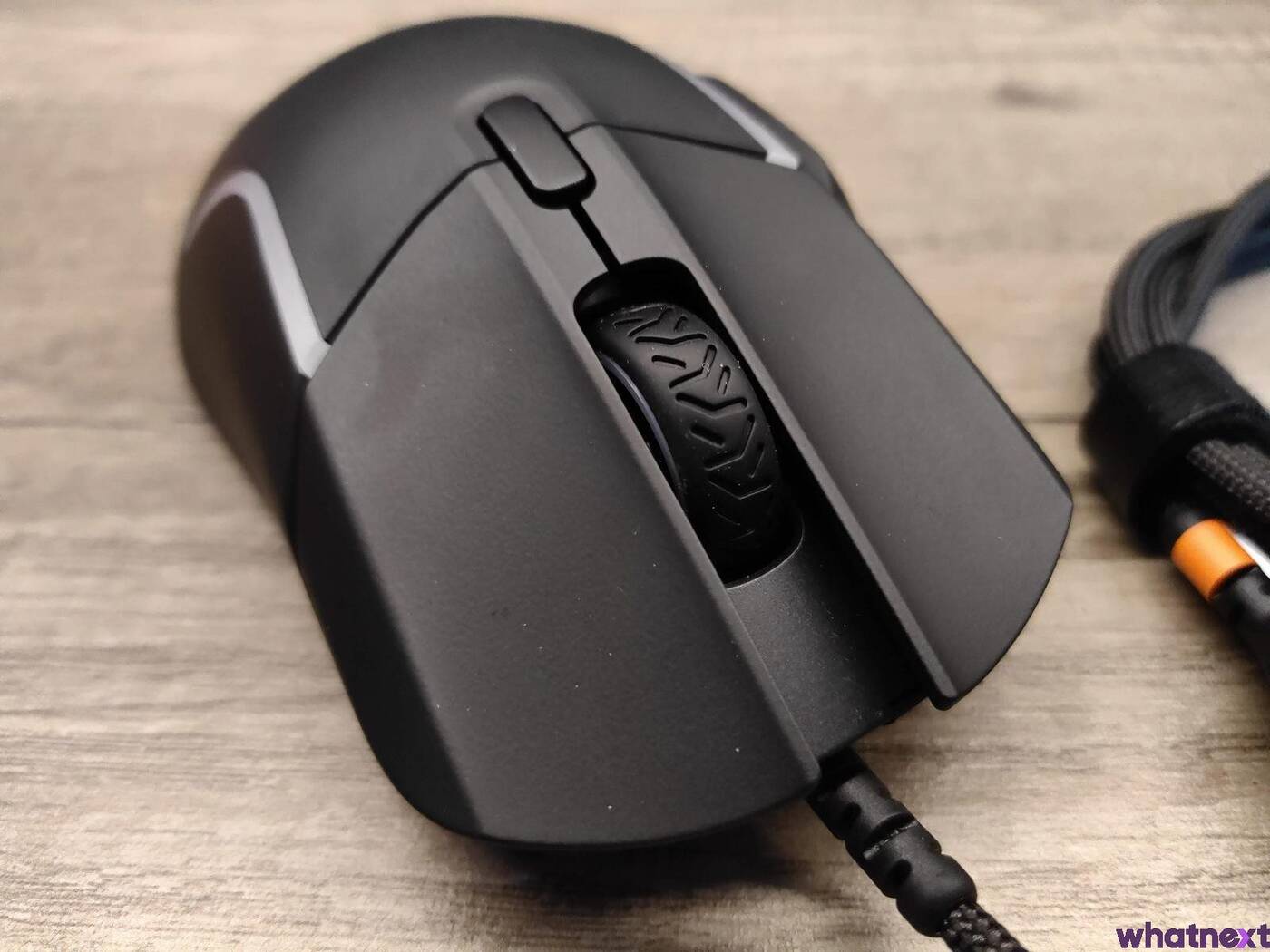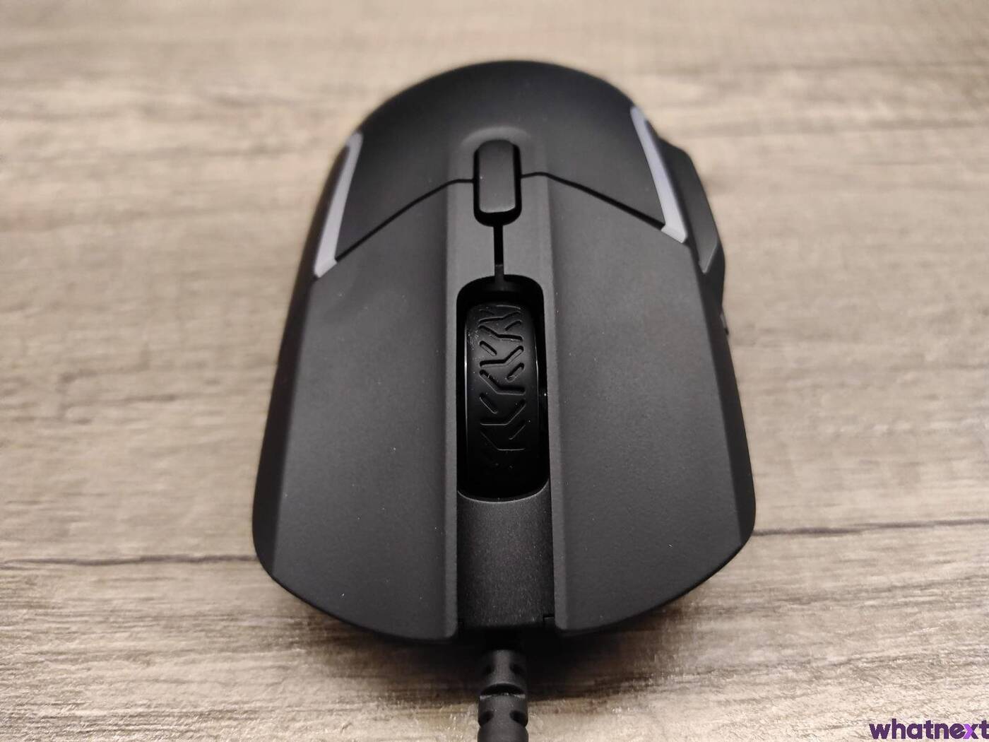 Ciekawie rozwiązano z kolei ten długi przycisk nad dwoma bocznymi, bo ten bazuje na dwóch przełącznikach i ma odmienne funkcje zależnie od naciśnięcia go „z góry” lub „z dołu”. Podczas grania jest przydatnym dodatkiem, ale tylko do jednorazowych akcji, bo jego miękki charakter zupełnie zaburzył responsywność. Warto też wspomnieć o przycisku funkcyjnym nad rolką, ale ten jest po prostu neutralny w działaniu.