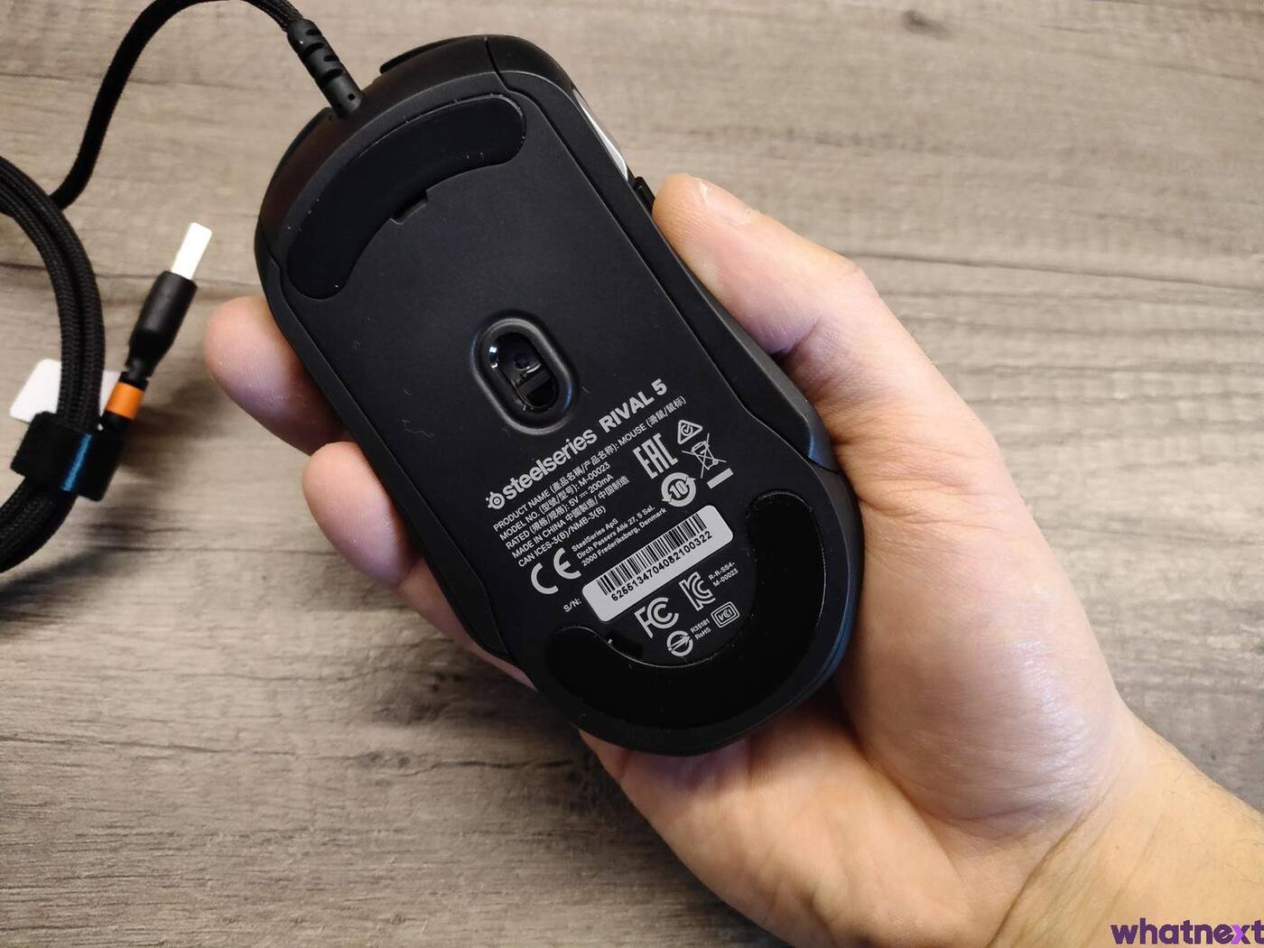 Mysz oferuje też wystarczająco miejsca na serdeczny i mały palec na swoim prawym boku, ale osoby o dłuższych palcach muszą nastawić się, że będą szurać ich opuszkami po podkładce. Kciuk z kolei odnajdzie się na Rival 5, jak w niebie, dzięki idealnemu wyżłobieniu, które zaprojektowano specjalnie tak, aby ułatwić dostęp do aż pięciu (fizycznie czterech) przycisków w tym miejscu.