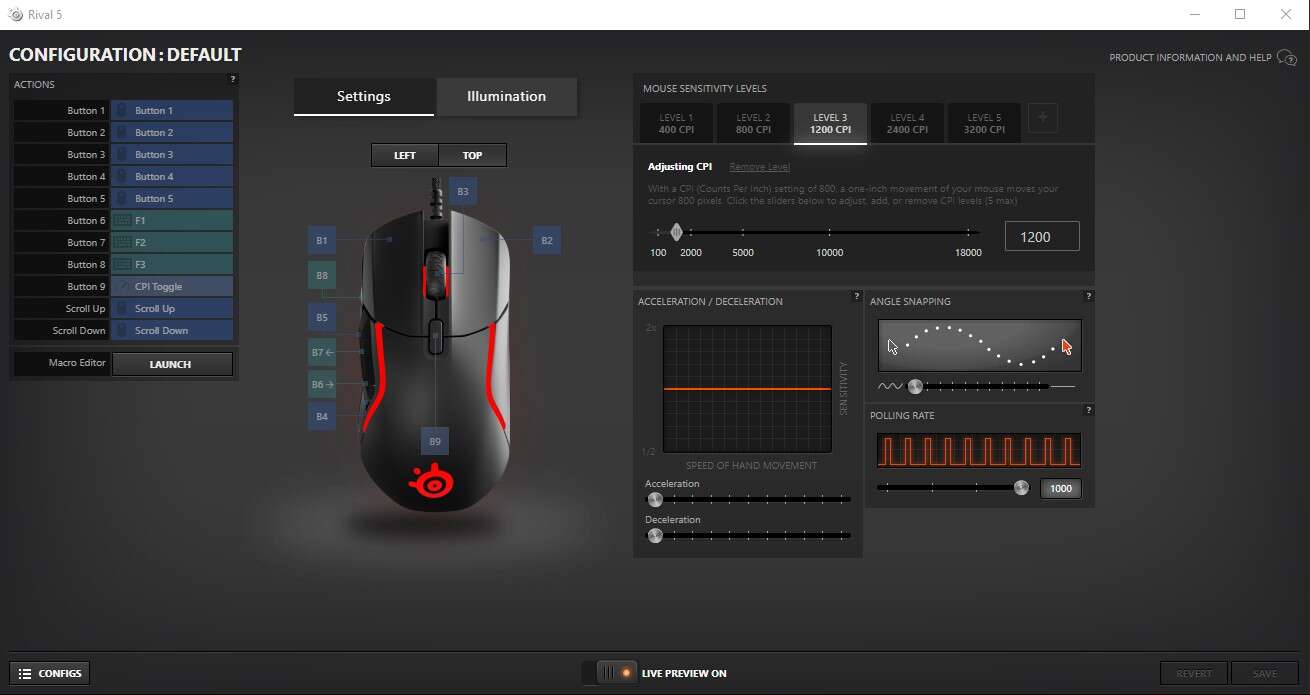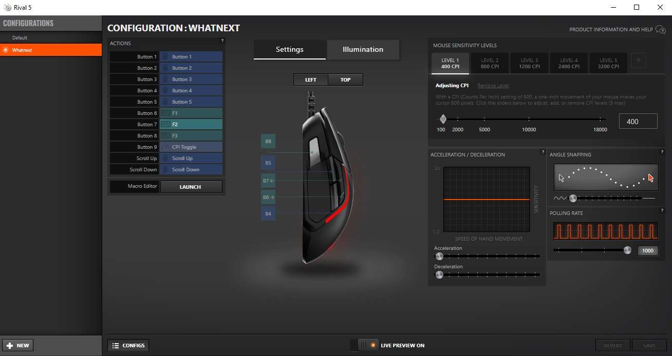 W drugim, czyli już w ustawieniach dedykowanych myszce, znajdziemy możliwość nadpisania funkcji każdego z dziewięciu przycisków, nagrania makra zarówno pod kątem aktywności myszki, jak i klawiatury, czy zabawy z podświetleniem. Po stronie sensora SteelSeries pozwala nam nie tylko na ustawienie czułości na pięciu poziomach (100-18000 DPI), czy ustawienie częstotliwości odświeżania myszy (125, 250, 500 i 1000 Hz), ale też ustawienie natężenia predykcji, czy zwiększenia i zmniejszenia prędkości w kolejno pierwszych i ostatnich fazach ruchu myszką.