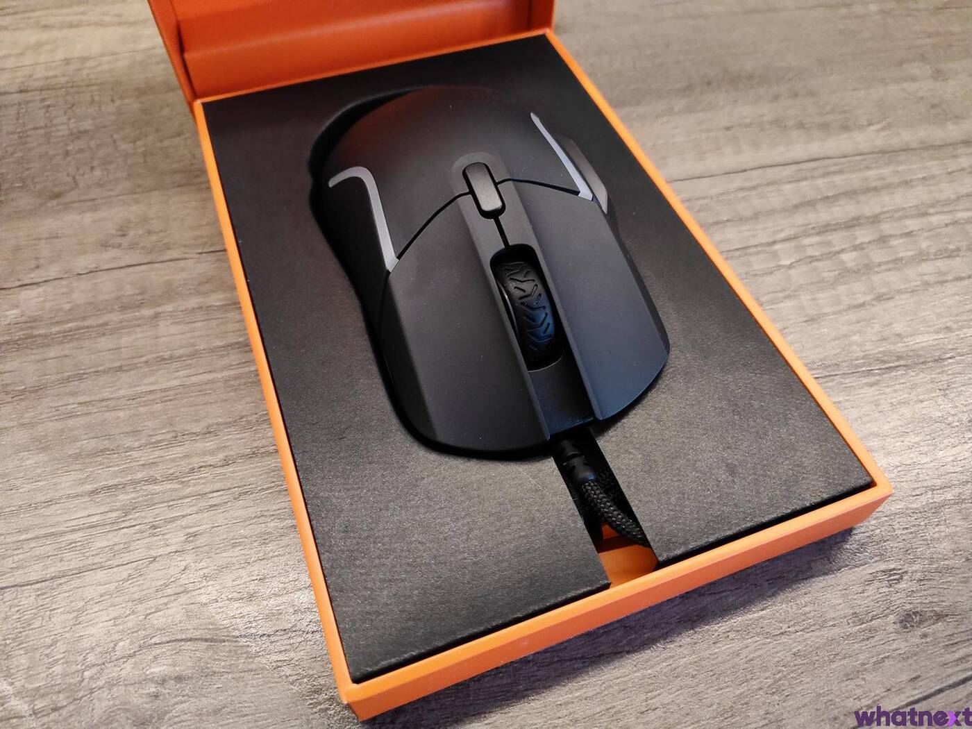 SteelSeries w ostatnim czasie najwidoczniej postarało się o poprawę samego pudełka, które zachowało dawny charakter sprzętów marki, ale teraz wyróżnia się na rynku swoim dwuelementowym podejściem. Wystarczy tylko pociągnąć górną część pudełka, aby ta dolna pozostała na blacie, prezentując nam mysz w plastikowej wyprasce bez jakiejkolwiek osłonki.