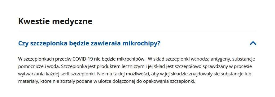 Nie wiem jak Wy, ale na początku byłem pewny, że to musi być kolejny fotomontaż. Niestety…. po wejściu na stronę internetową gov.pl poświęconą szczepionce na COVID-19, w sekcji Kwestie medyczne(!) działu Pytania i odpowiedzi mamy takie oto cudo.