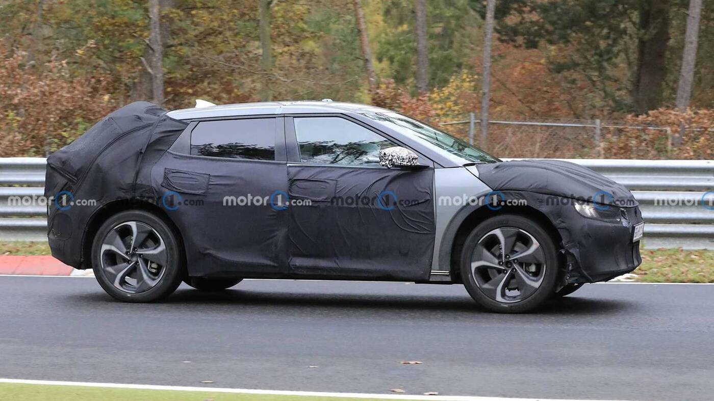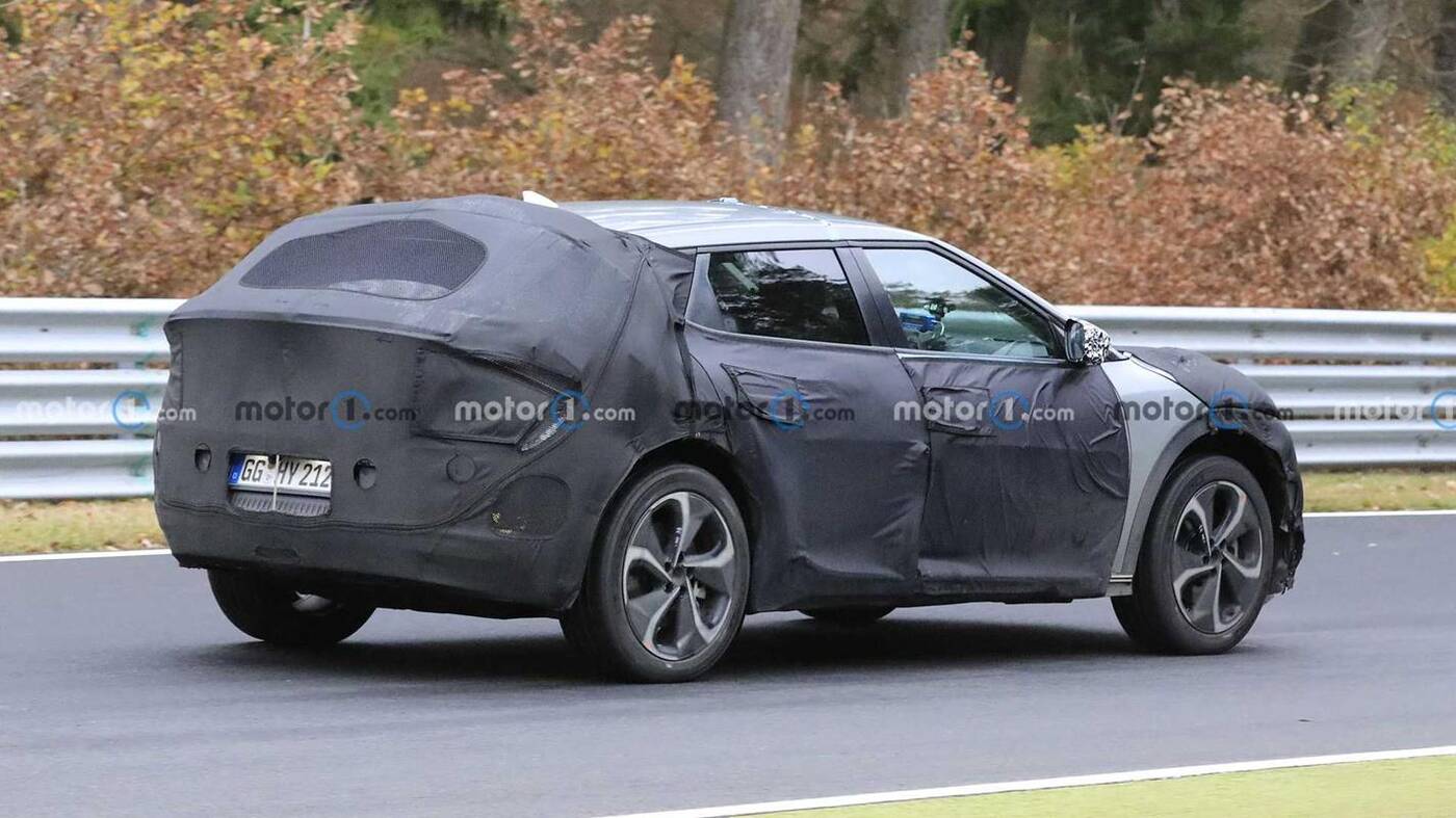 W przypadku tego elektrycznego crossovera nadal nie posiadamy nawet jego nazwy, ale przypomina pewne połączenie koncepcji Kia Imagine oraz Futuron sprzed roku, a nawet nowego SUVa Sportage, kiedy spojrzymy na niego z boku. Linie tego modelu są jednak ostrzejsze, a dach wygląda na niższy, choć kamuflaż robi w tej kwestii swoje.