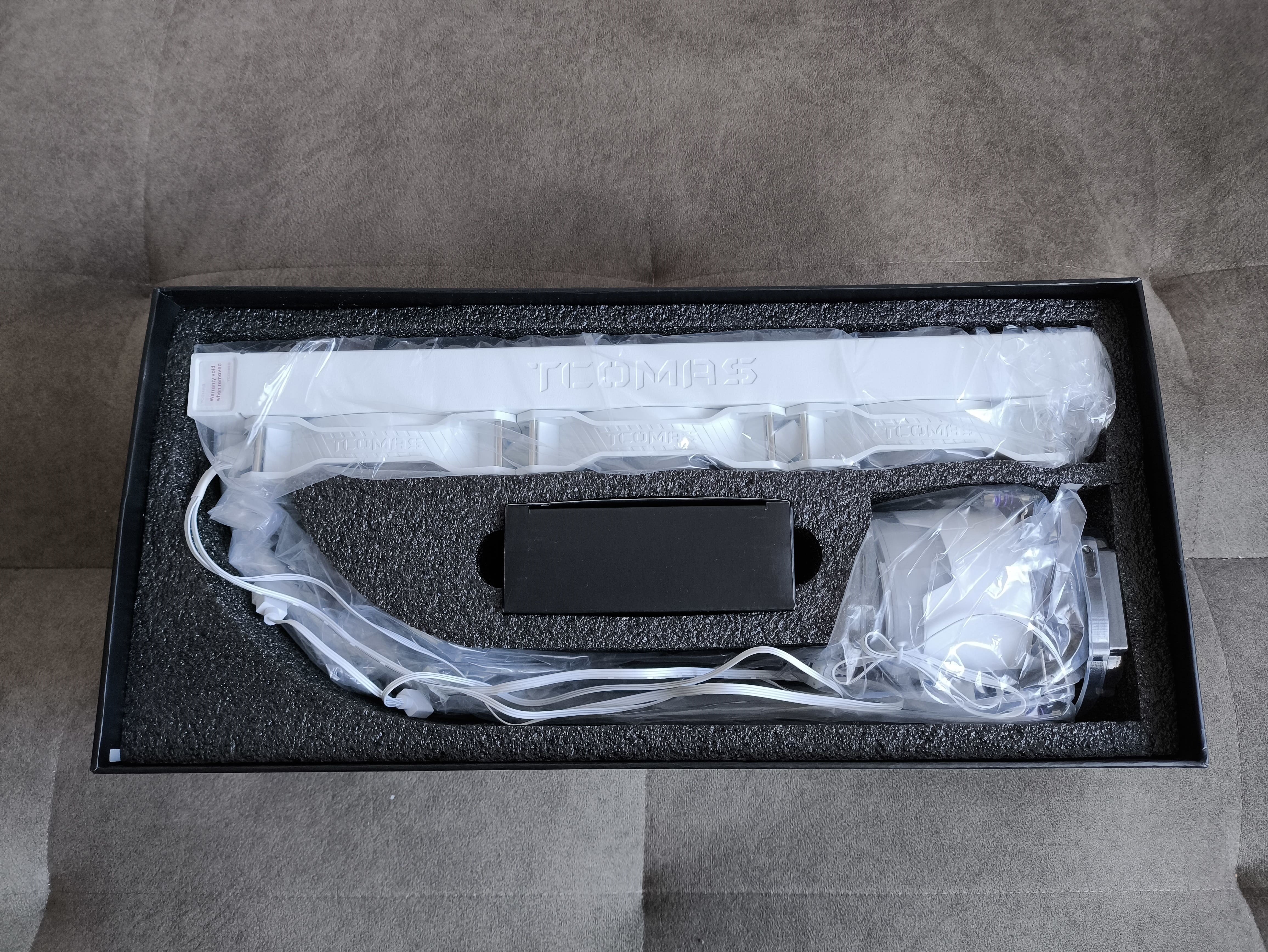 Jedno z najtańszych w ofercie chłodzeń marki TComas, tj. model LE100 360 mm, zapakowane jest w solidnym opakowaniu — wnętrze zabezpieczono wystarczająco – nie jest to poziom modelu LA200, ale też i cena nie ta sama wszak. Najważniejsze, że blokopompa i pozostałe elementy także zostały skutecznie ochronione. Więcej i tak w sumie nie potrzeba dla 95% kupujących.