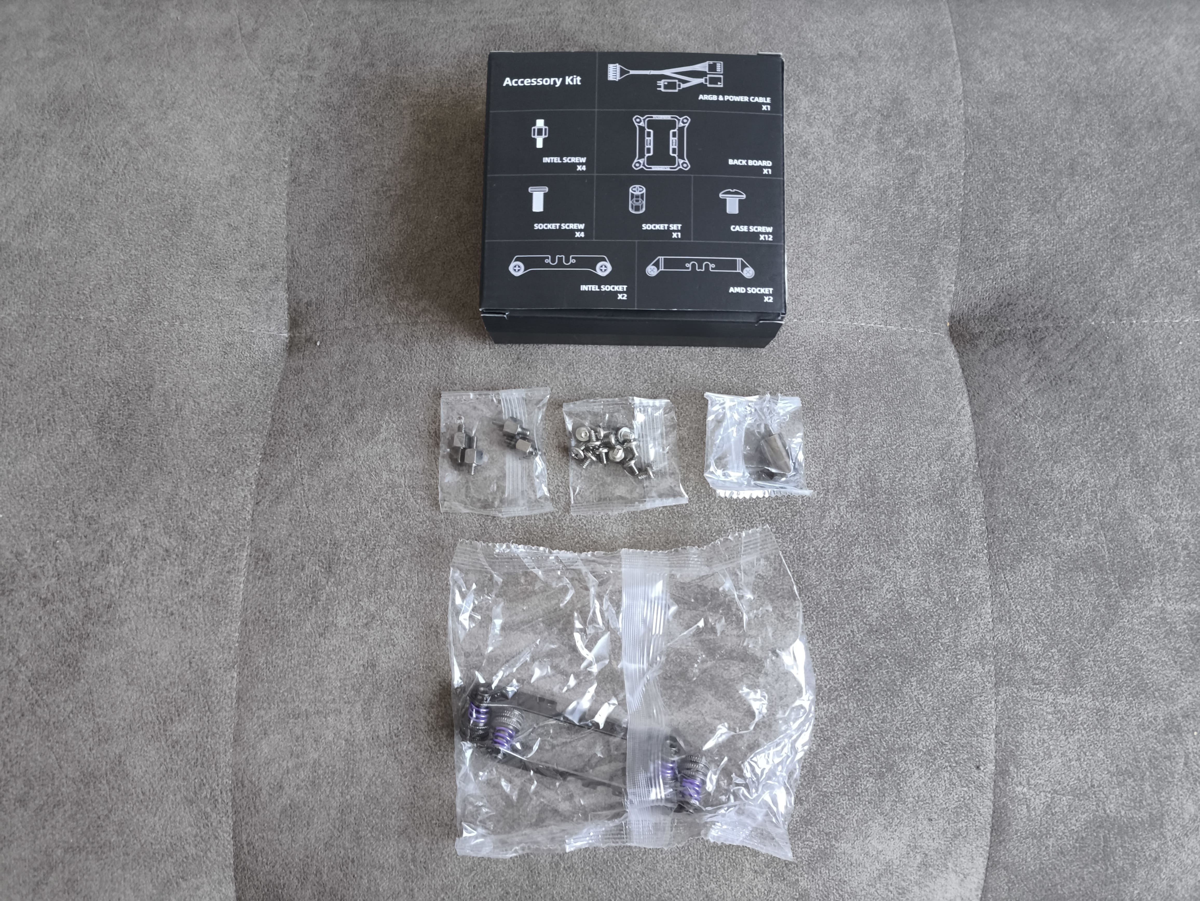 W zestawie z chłodzeniem znajdziemy kompletne systemy montażowe (śruby, płozy, backplate, dystanse) zarówno dla platform AMD, jak i Intel. Niestety mamy brak tu fizycznego rozdzielenia elementów montażowych na podzespoły AMD/Intel, co wymaga od użytkownika większej uwagi przy kompletowaniu zestawu.