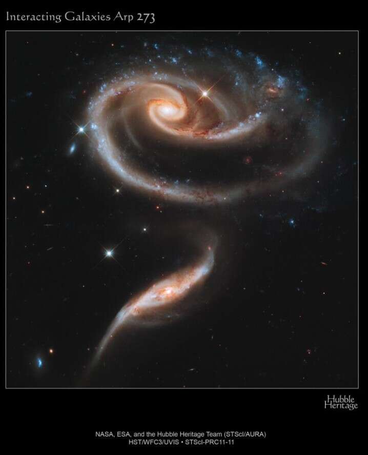Obraz przedstawia wczesny etap galaktycznego spotkania i podkreśla chaotyczny efekt, jaki grawitacja może mieć na jedną z najwspanialszych skal we Wszechświecie, jakie można sobie wyobrazić.