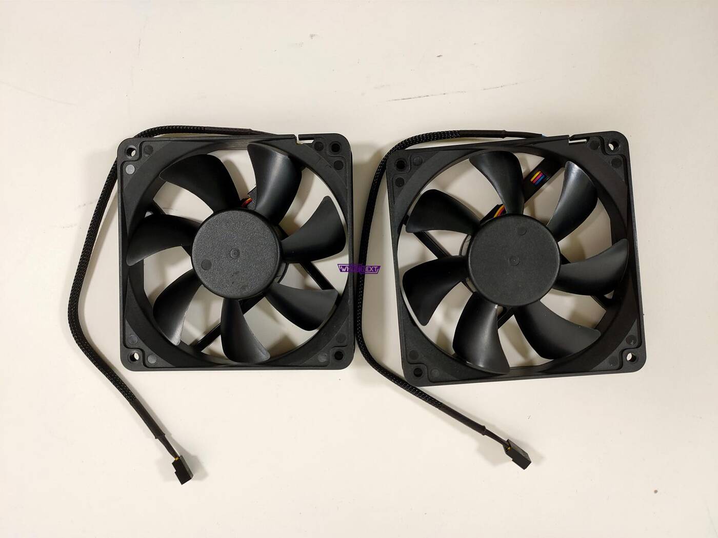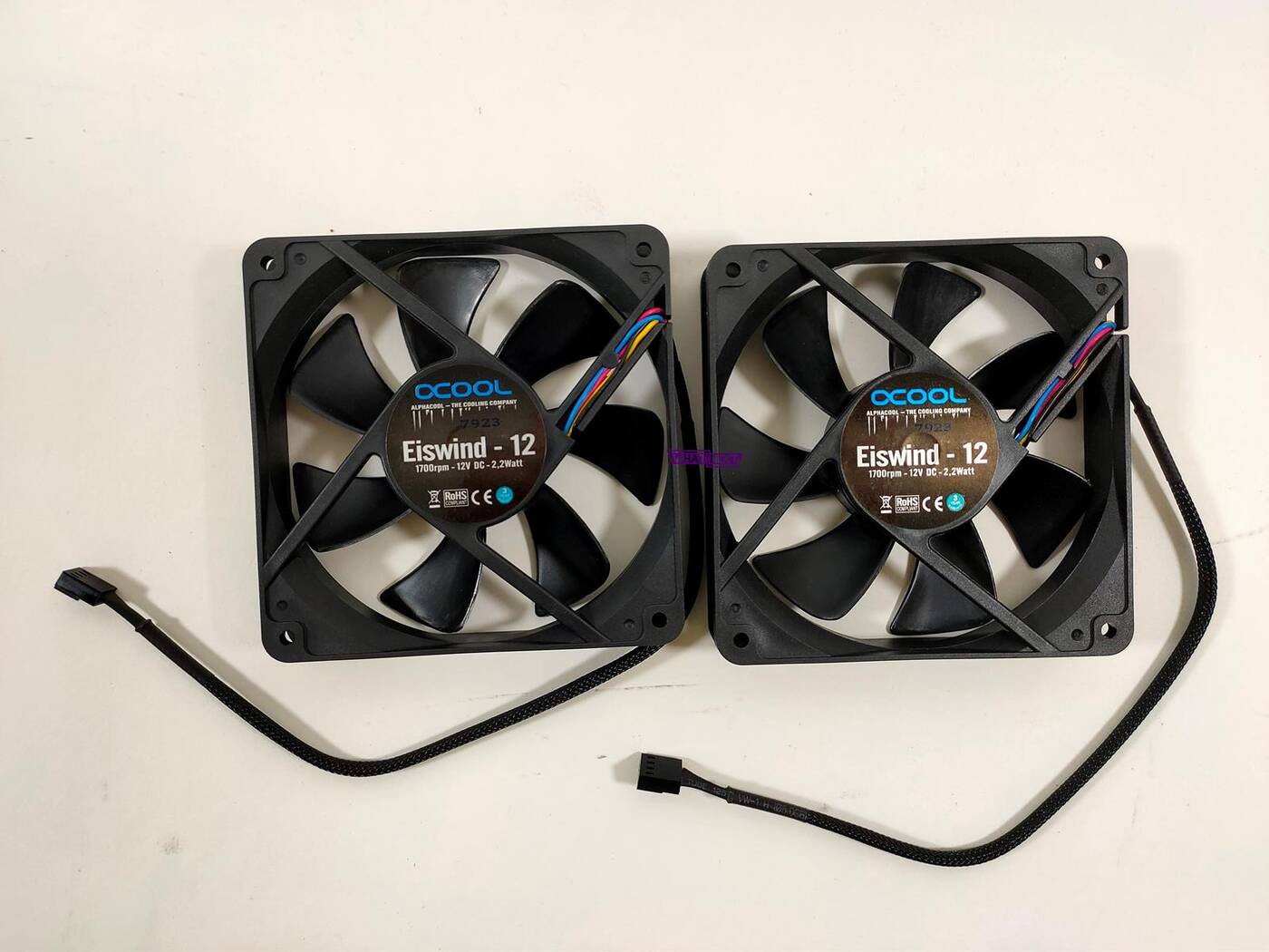 W zestawie otrzymujemy dwa 120 mm wentylatory Eiswind. Ich maksymalna prędkość wynosi 1700 RPM, przepływ powietrza 63,85 CFM, ciśnienie 1,66 mmH2O a głośność 29 dBA. Wentylatory mają PWM więc może nimi sterować płyta główna.