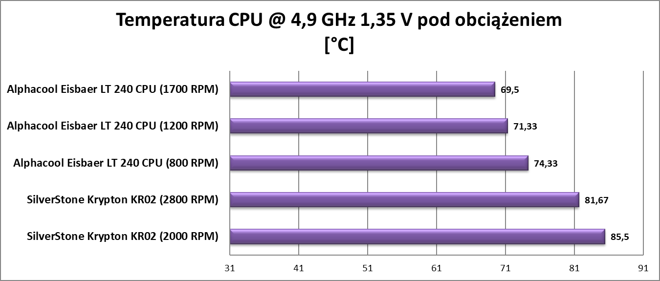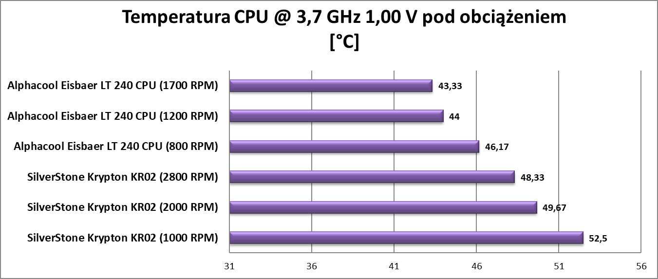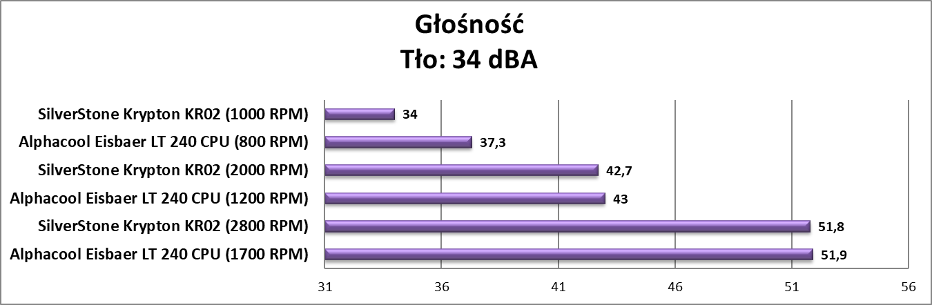 Wyniki są, zgodnie z oczekiwaniami świetne. Alphacool Eisbaer LT 240 CPU nawet przy 800 RPM poradzi sobie z podkręconym 9600K. Możecie więc oczekiwać dobrej kultury pracy nawet po mocnym OC. Odnośnie głośności to dopiero na 1700 RPM chłodzenie może przeszkadzać. Na 1200 RPM prezentuje ono średnią głośnośc a na 800 RPM nie powinniście jego słyszeć. Pompka także pracuje raczej cicho.