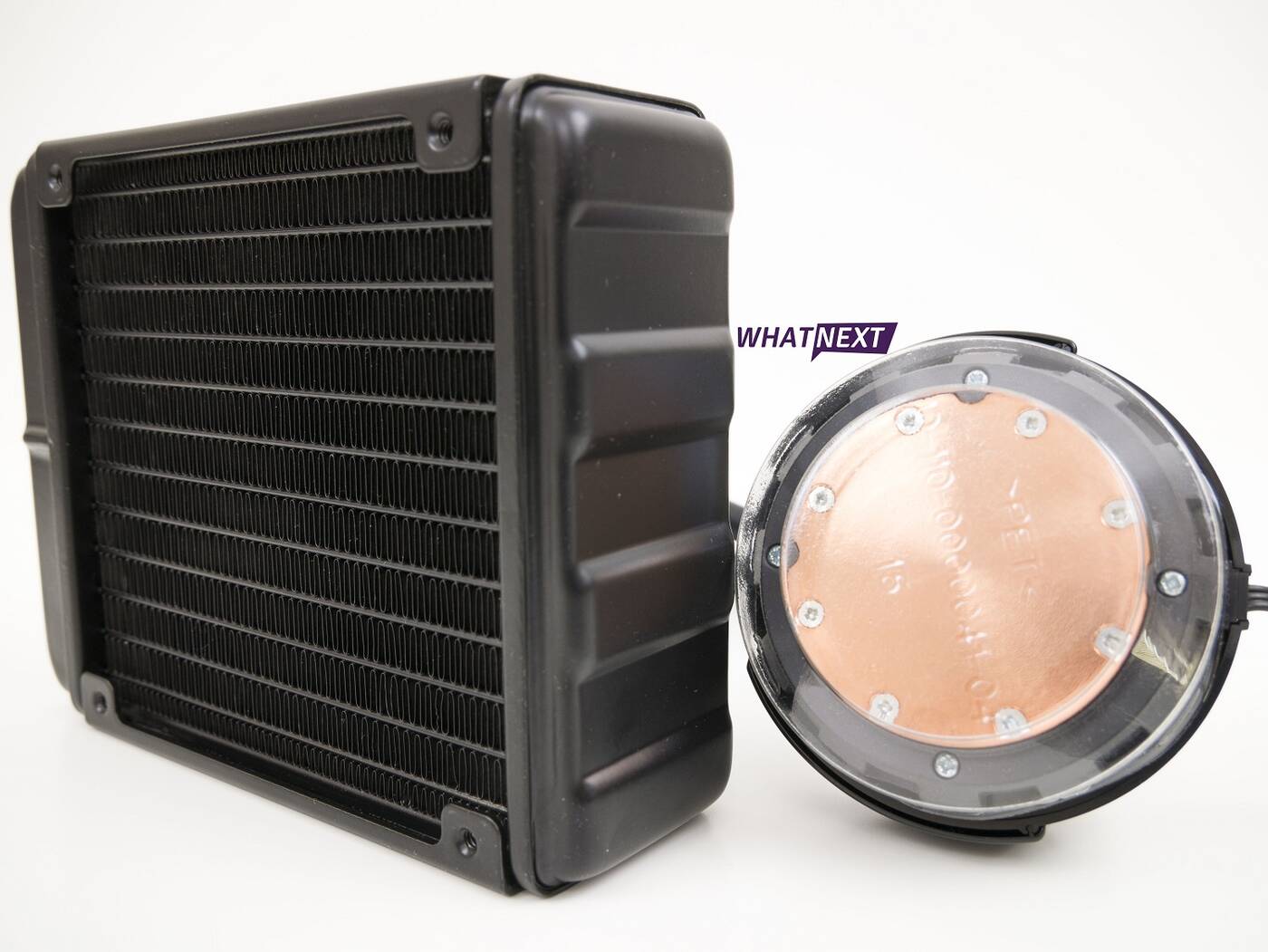 Liquid Freezer 120 to mniejszy model wersji 240, więc wygląda tak samo. Jest to dobry design, ale jakoś szczególnie nie powalający. Chłodnica ma wymiary 120 mm x 155 mm x 49 mm i została wykonana z aluminium. Jest ona grubsza od konkurencyjnych rozwiązań. Z blokiem montowanym na procesorze łączą ją dwa wężę o długości 326 mm. Są one dosyć elastyczne a długość powinna spokojnie wystarczyć do montażu chłodnicy w dowolnym miejscu. Pompka ma wymiary 82 mm x 82 mm x 40 mm. Zbyt wiele informacji o niej producent nie ujawnia. Wiadomo, że pracuje w zakresie napięć od 5 V do 12 V i pobiera 2 W mocy. Podstawka została wykonana z miedzi i porządnie wyszlifowana.
