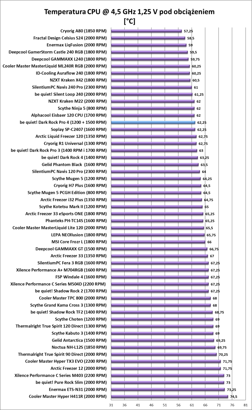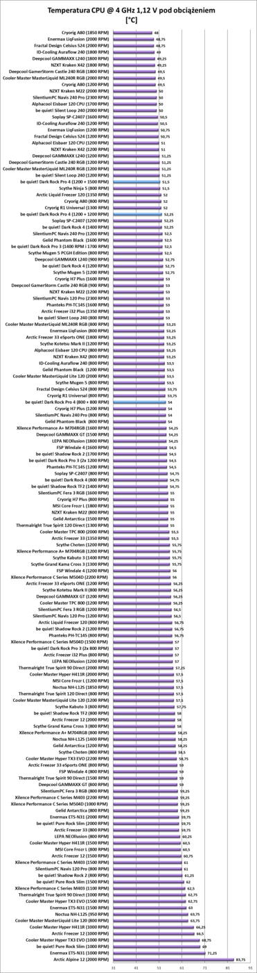 Chłodzenie bardzo dobrze wypada w testach. Tak naprawdę przygrywa jedynie z zestawami AiO. Jest to topowa wydajność na każdych obrotach wentylatorów. Także kultura pracy jest świetna i dotyczy to także maksymalnych obrotów. Chłodzenie praktycznie zawsze będzie ciche.