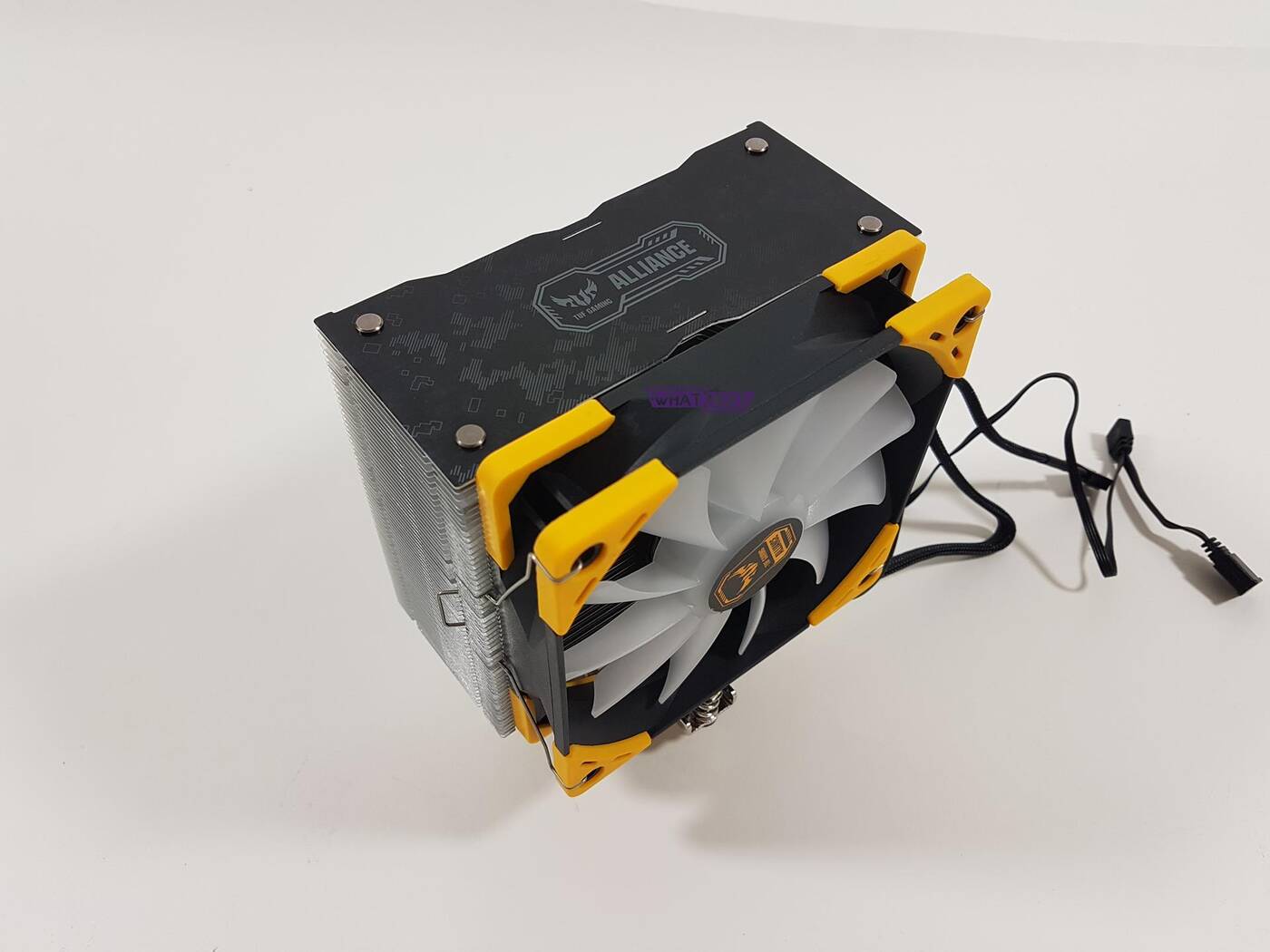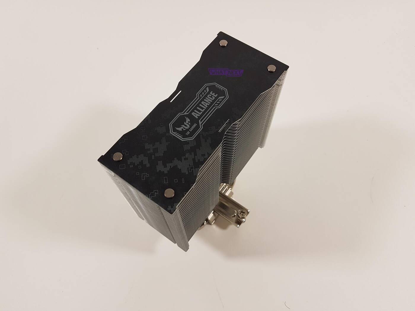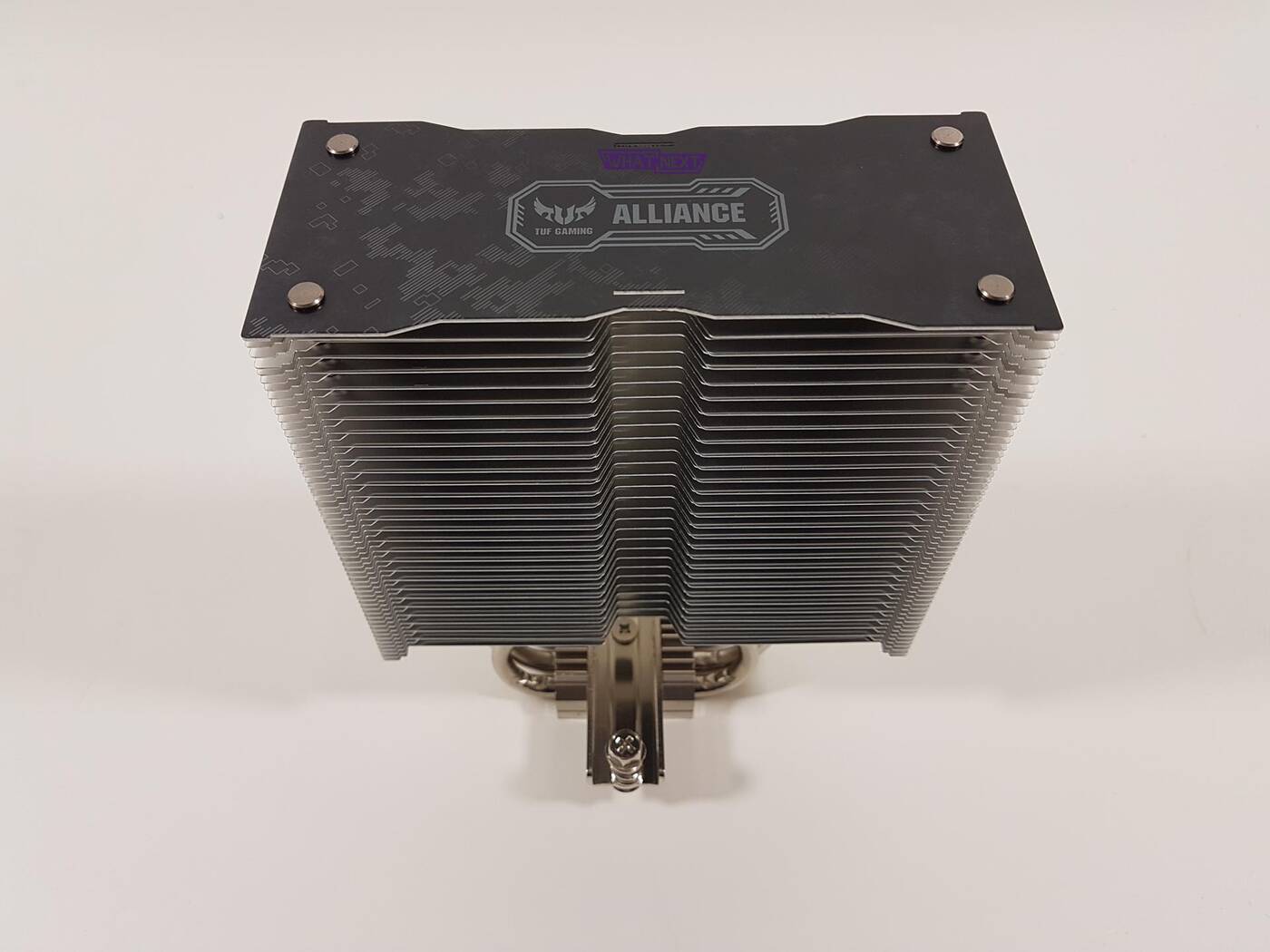 Chłodzenie wygląda rewelacyjnie. Na samej górze znajduje się nakładka utrzymana w kolorystyce charakterystycznej dla TUF Gaming Alliance. Sam wentylator też jest podświetlany i można nim sterować za pomocą Asus Aura. Razem całość wygląda znakomicie. Sam radiator niczym nie różni się od zwykłej wersji. Ponownie jest podstawka wykonana na lustro oraz cztery 6 mm ciepłowody. Wykonanie jest bardzo dobre.