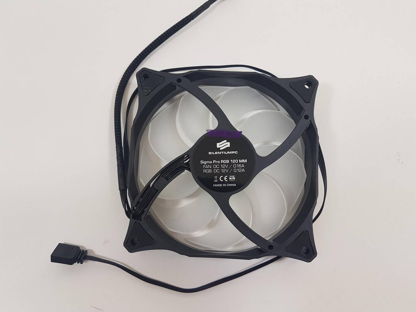Dołączony wentylator to model Sigma HP RGB 120 mm. Jego maksymalna prędkość wynosi 1600 RPM a przepływ powietrza wynosi 52 CFM. Co ciekawe, producent nie mówi nic o głośności. Wentylator oparty został o łożysko hydrauliczne (HBS) i posiada wtyczkę 4 pin. Tak jak wspominałem, świetnie wygląda on z radiatorem.