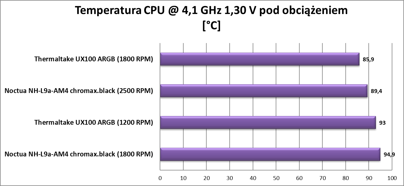 Zgodnie z oczekiwaniami chłodzenie na styk dało sobie radę z procesorem. Temperatury są wysokie i na pewno wymagane będą maksymalne obroty wentylatora, aby cooler poradził sobie z jednostką średniej klasy. Wtedy też chłodzenie będzie trochę głośne, co może przeszkadzać. Jednakże na 1200 RPM jest już cisza i przy słabszych procesorach Thermaltake UX100 ARGB będzie właśnie znacznie ciszej działał. Nie jest to więc konstrukcja stworzona dla procesorów średniej klasy, ale bardziej dla tych słabszych.