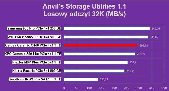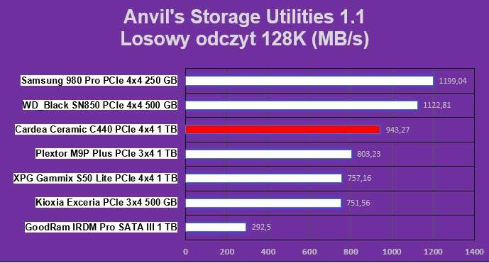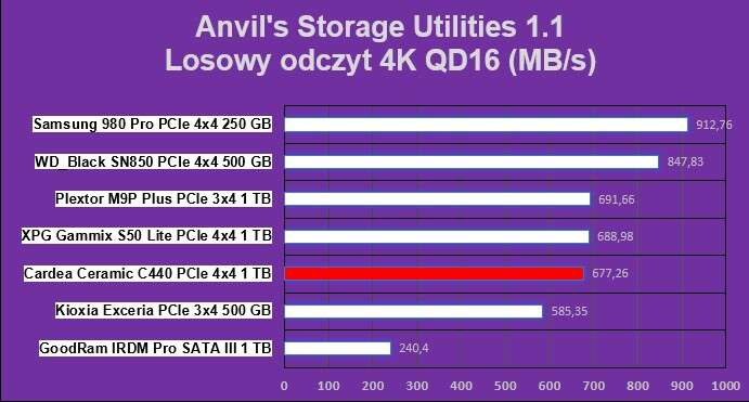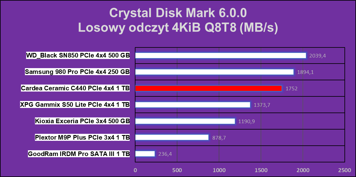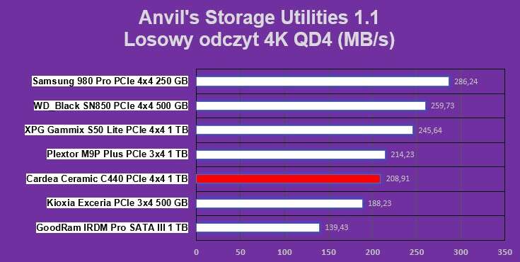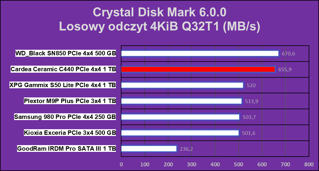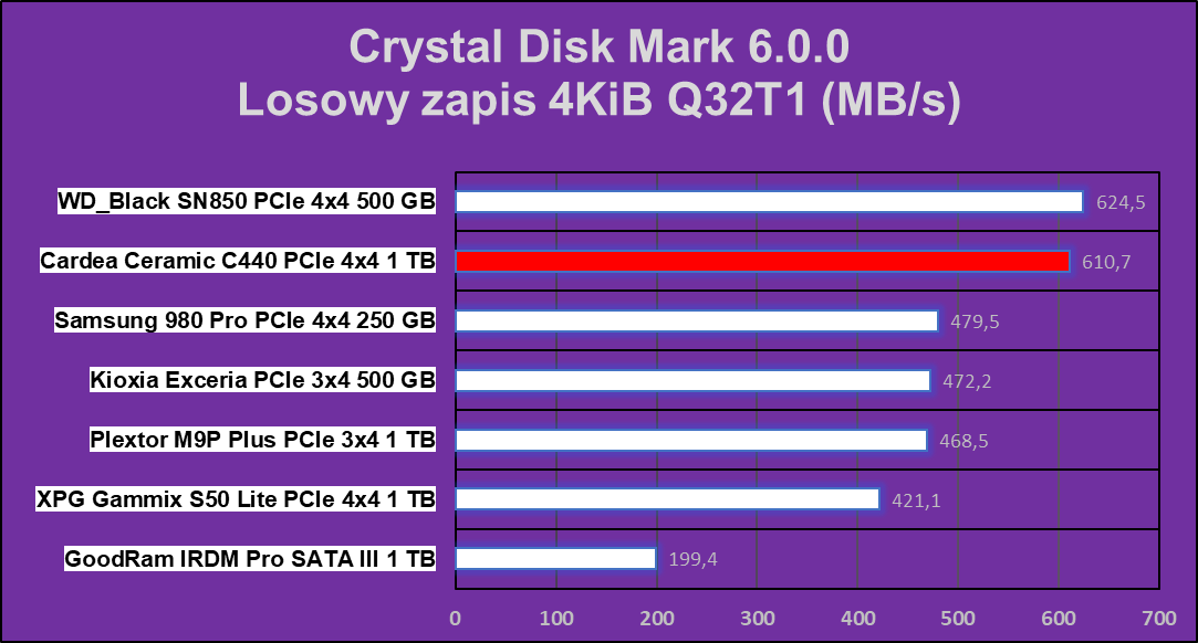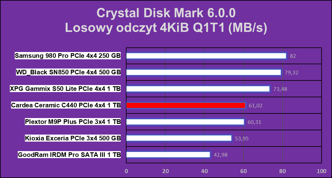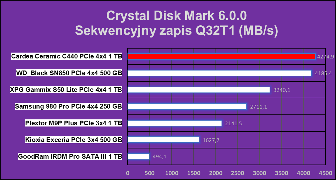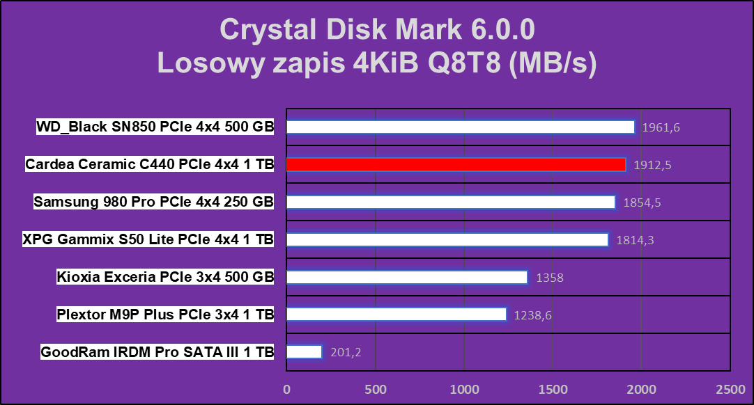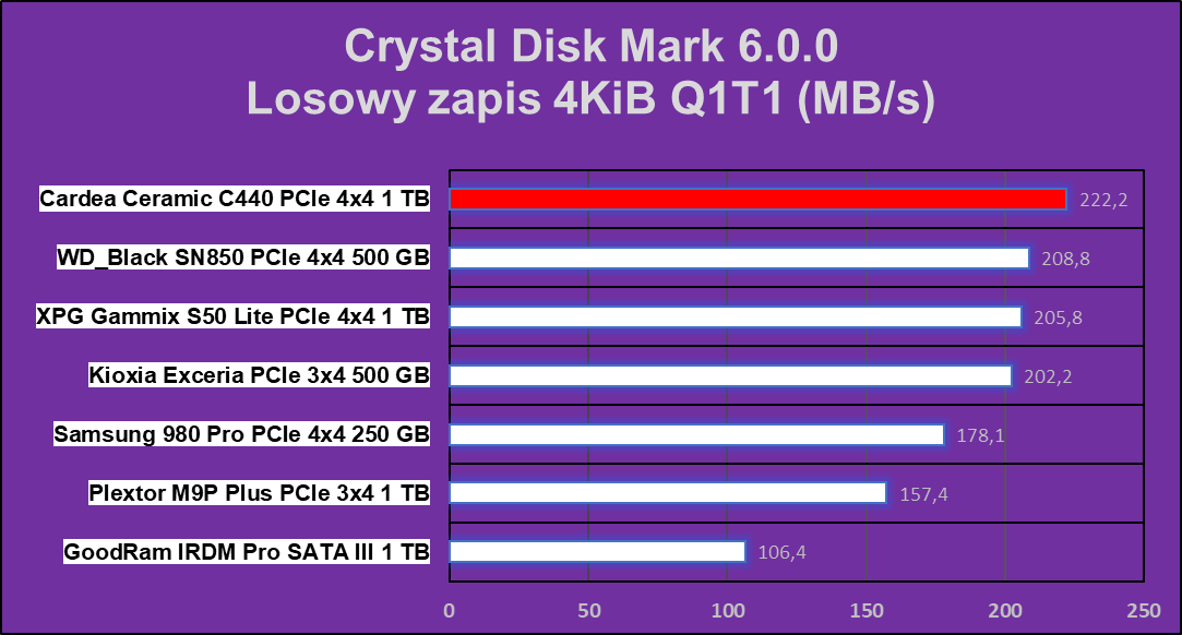W obu benchmarkach (wyniki poniżej) dysk Cardea Ceramic C440 pokazał, że jeśli idzie o zapis, nie ma w znakomitej większości przypadków sobie równych, ale ogół wydajności w odczycie postawił go tuż za Samsungiem i WD_Black, które znacząco przewyższają go w operacjach sekwencyjnych.