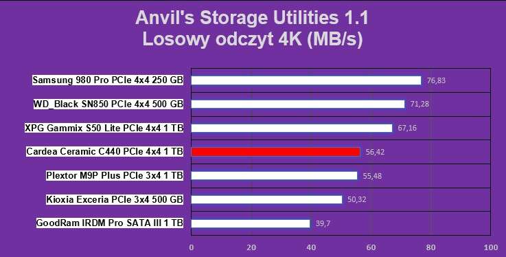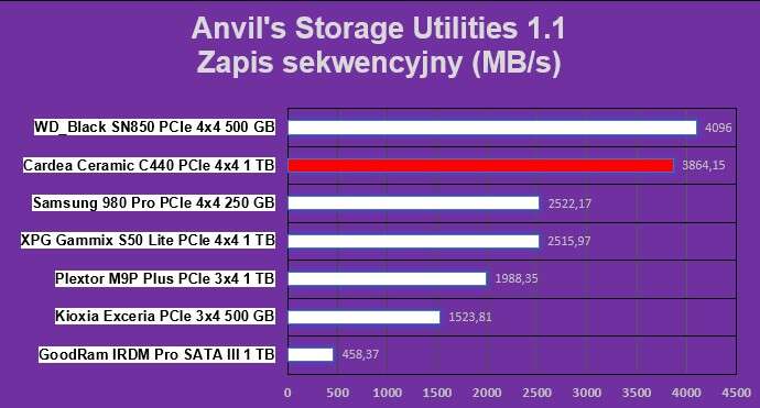 Dlatego też pozostałe testy Cardea Ceramic C440 1 TB przeprowadziłem z chłodzeniem dołączonym do płyty głównej, dzięki któremu dysk nie rozgrzewał się ponad podany przez T-Force zakres temperatury. Tak jak już wspomniałem wyżej, nie spotkałem się jeszcze z dyskiem PCIe 4.0, który bez chłodzenia nie miałby problemu z temperaturami. Jeśli więc chcecie sięgnąć po Cardea Ceramic C440 1 TB, zadbajcie o dodatkowe chłodzenie.