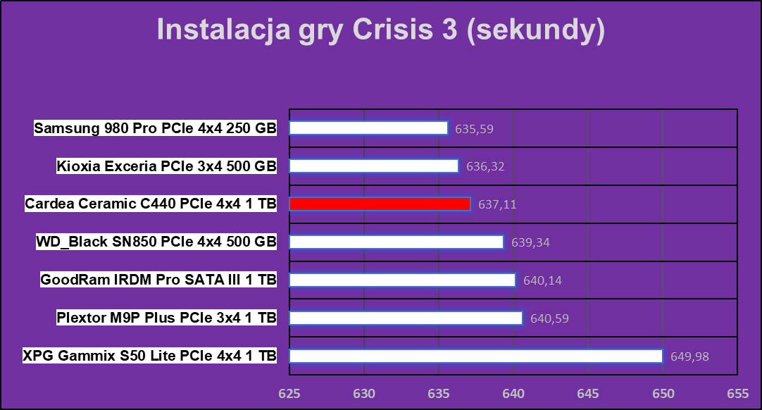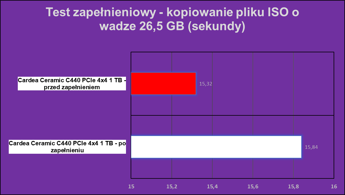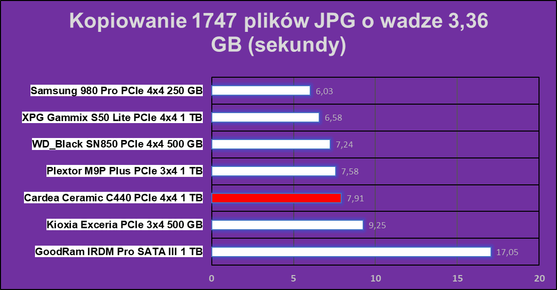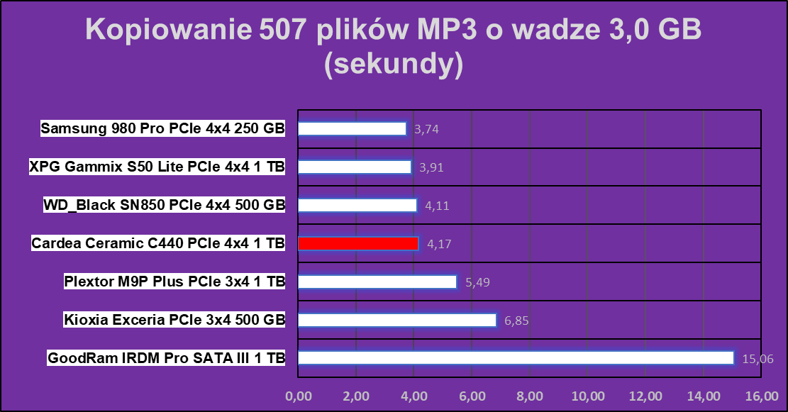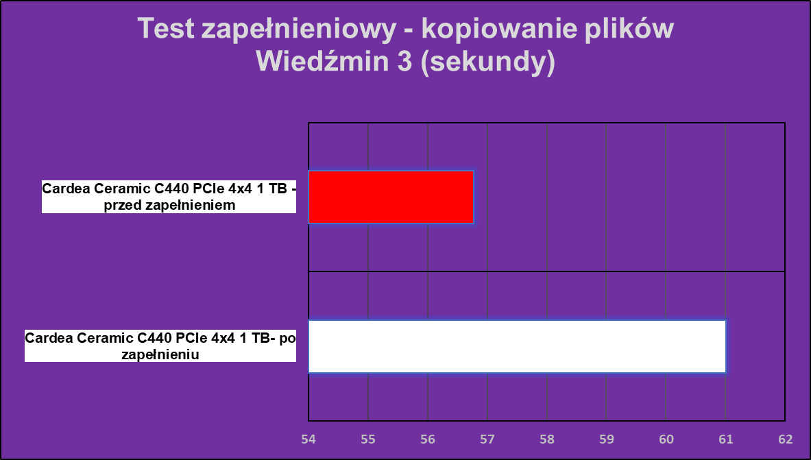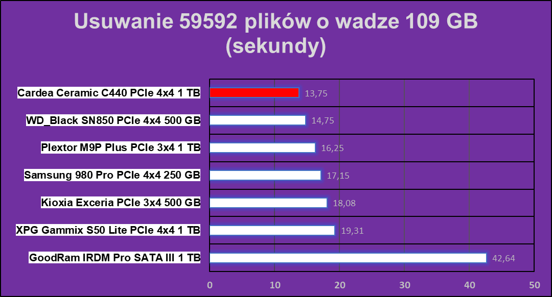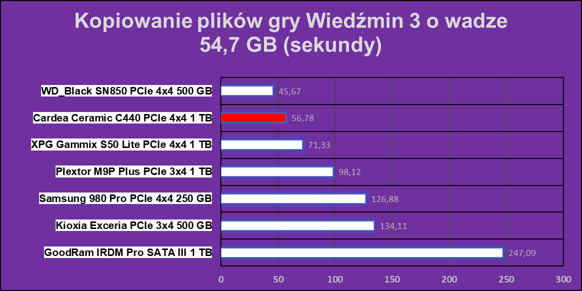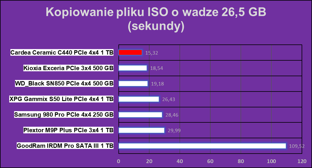 Kopiowanie plików, to wyzwanie angażujące zarówno odczyt, jak i zapis dysku, dlatego z góry mogliśmy oczekiwać, że C440 nie będzie tutaj panował. Jednak wyróżnia się na tle konkurencji w usuwaniu plików, kopiowaniu całej masy plików gry, a nawet (wbrew rozsądkowi) przenoszeniu dużego pliku ISO.