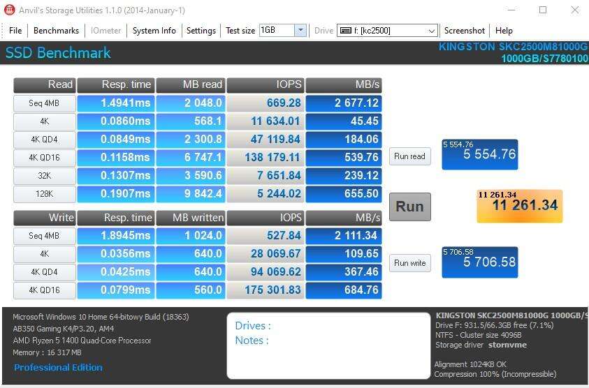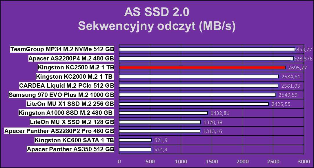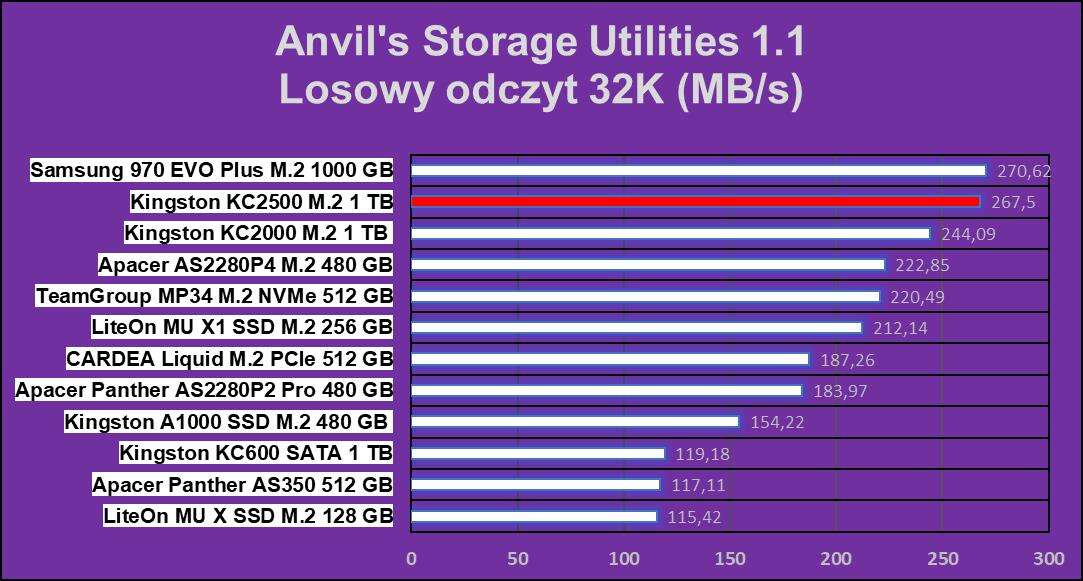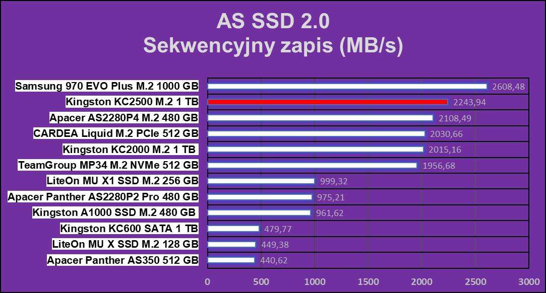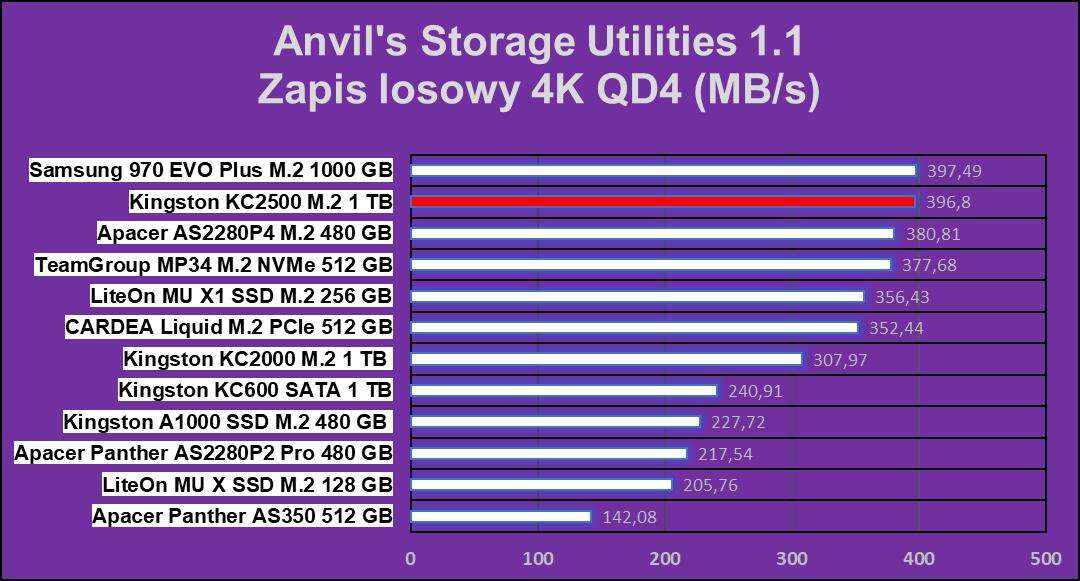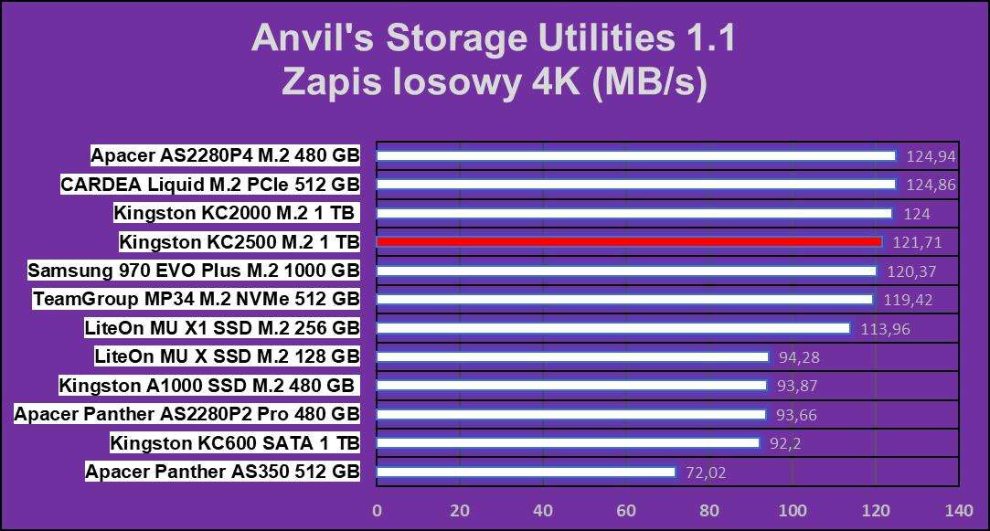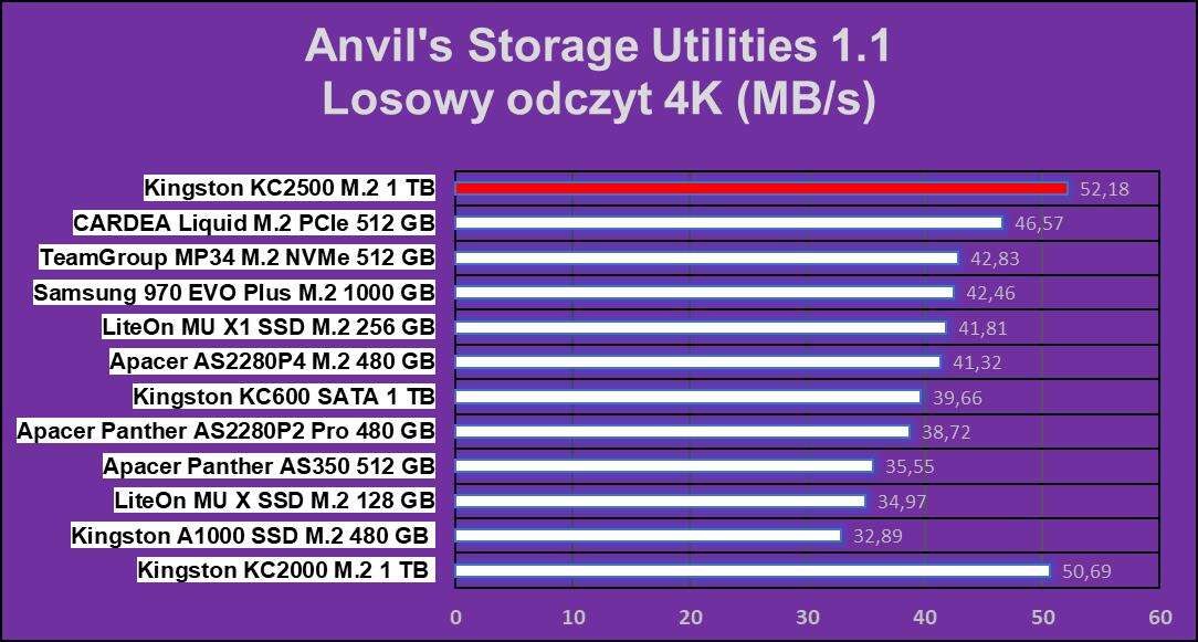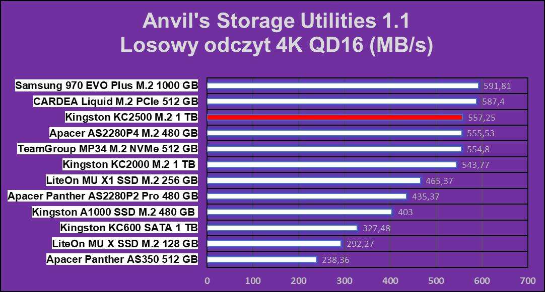 W bratobójczym pojedynku test w Anvil wykazał bezwzględną wyższość testowanego modelu, co również miało miejsce w Crystal Disk Mark. ASSSD był tutaj anomalią, ale wszystkie trzy programy wykazały, że KC2500 1 TB jest topowym dyskiem, jakiego do tej pory testowaliśmy.