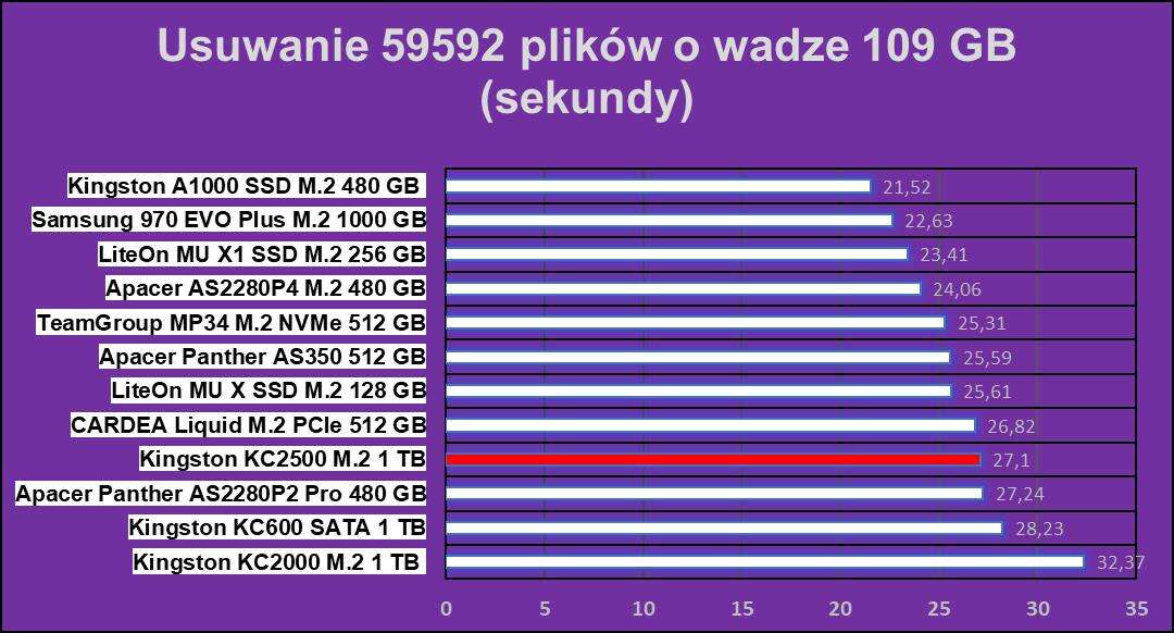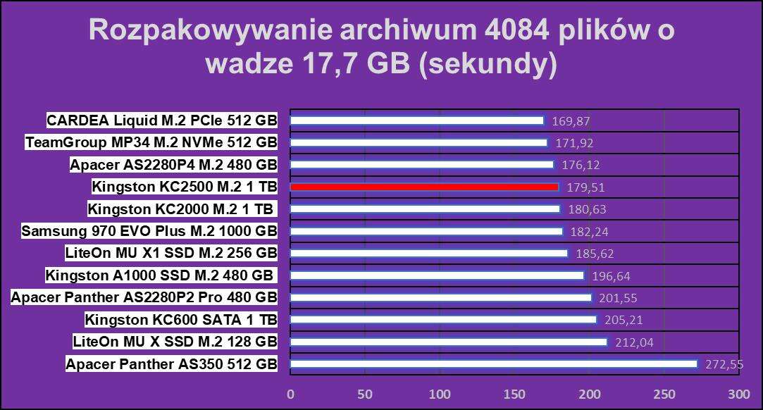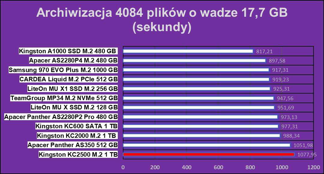 I na całe szczęście, ku uciesze producenta, w naszej procedurze testowej KC2500 poszczycił się nieokazałymi słupkami w typowych zadaniach, ale okazał się totalnie niewydajny przy archiwizacji i usuwaniu sporej paczki plików.