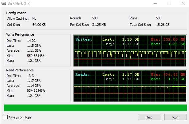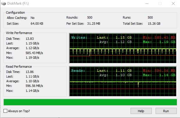 Wszystkie testy zostały przeprowadzone na 64-bitowym systemie operacyjnym Windows 10 Home i systemie plików NTFS z jednostką alokacji wynoszącą 4096 bajtów. Wyniki stanowią średnią z trzech przeprowadzonych w identycznych warunkach odczytów. Nie dajcie się zwieść występującym niekiedy przepaściom ukazanym na wykresach i przed wyciąganiem wniosków, rzućcie okiem na narzuconą skalę.
