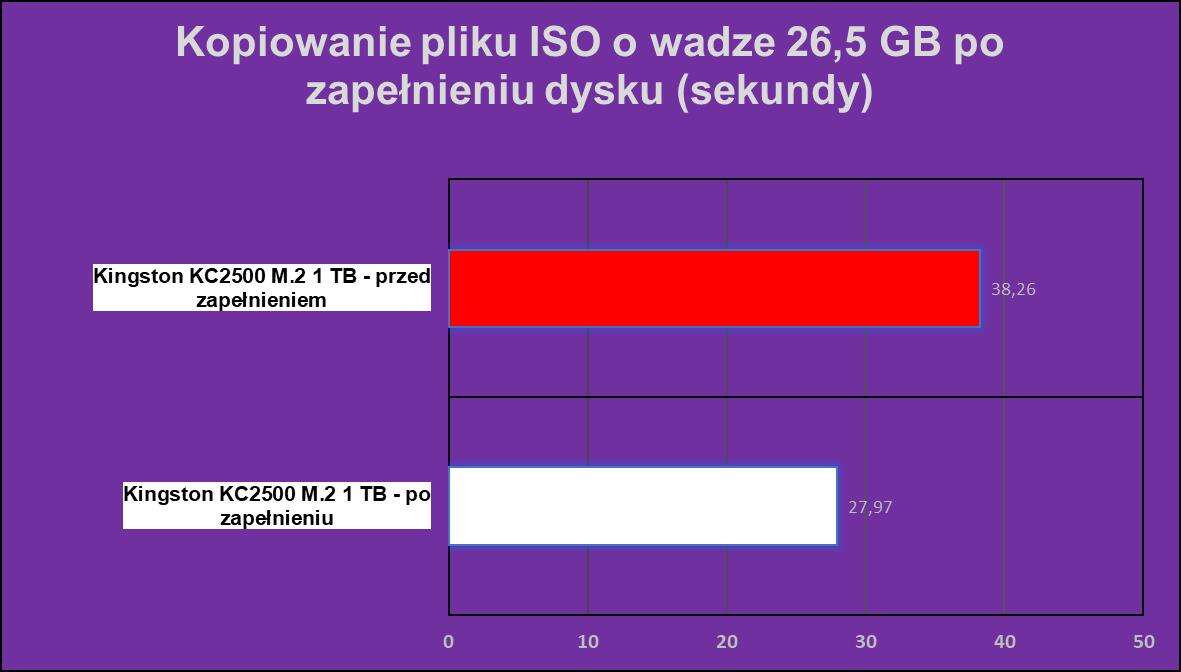 Tutaj wydajność dysku Kingston KC2500 1 TB wypada już nie tak dobrze, jak w przypadku testów syntetycznych. Oczywiście – w grę wchodzą niewielkie różnice, ale to sprawia, że wydajność nie pokrywa się z wynikami w programach.