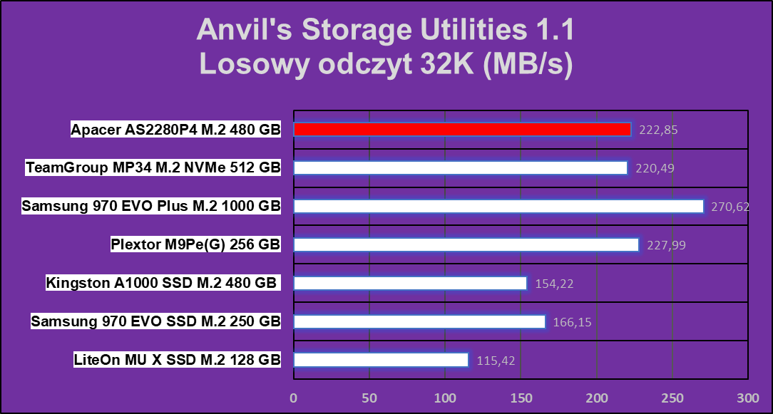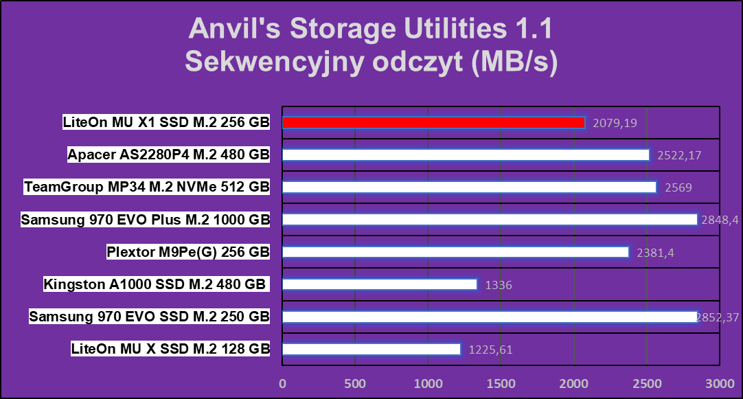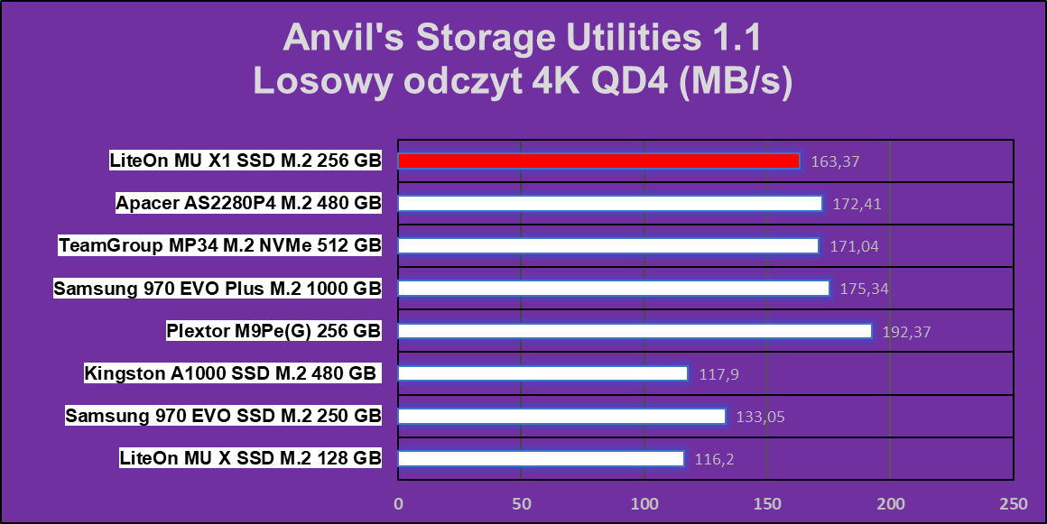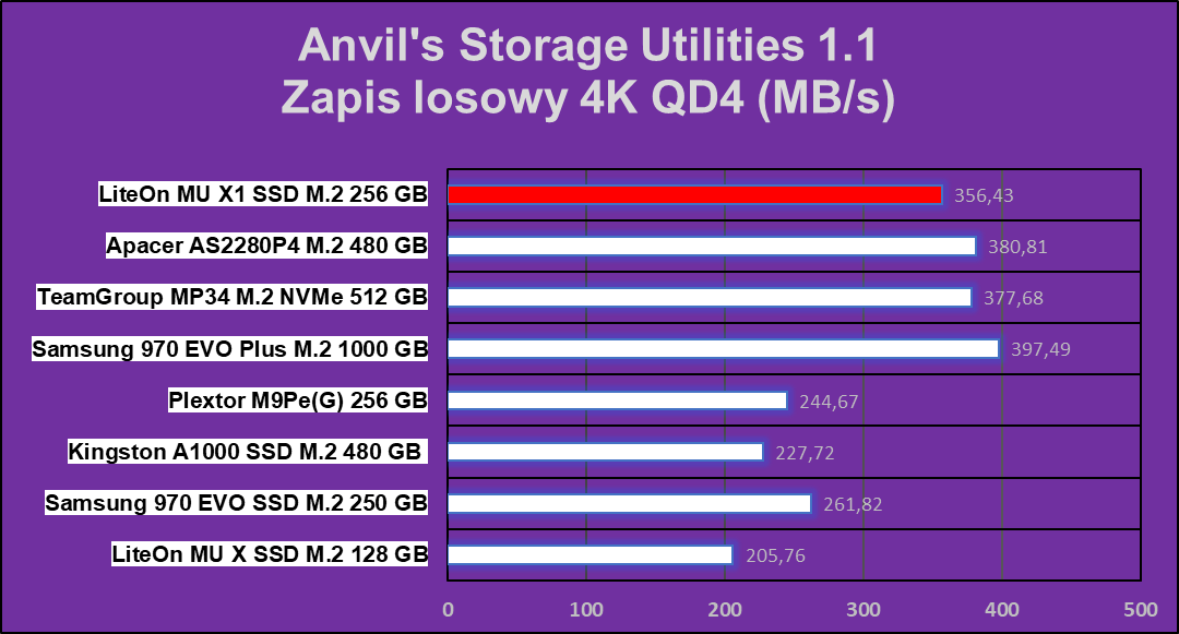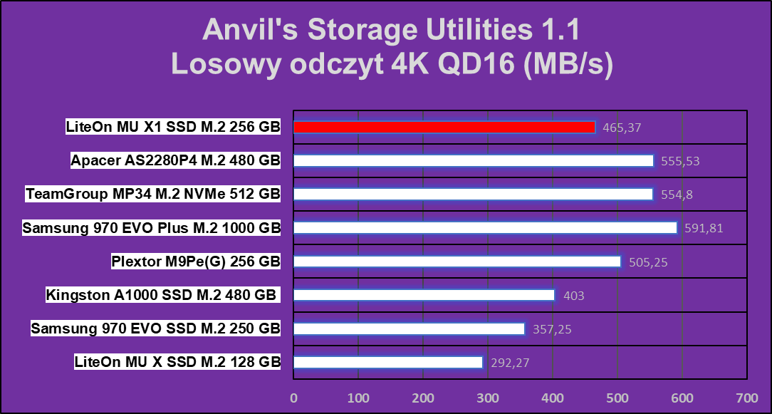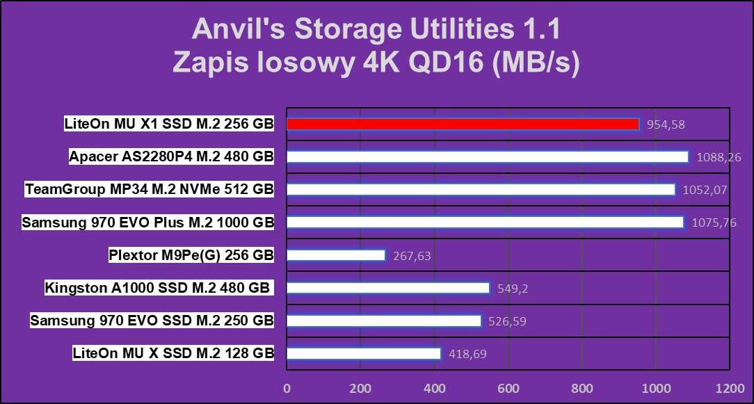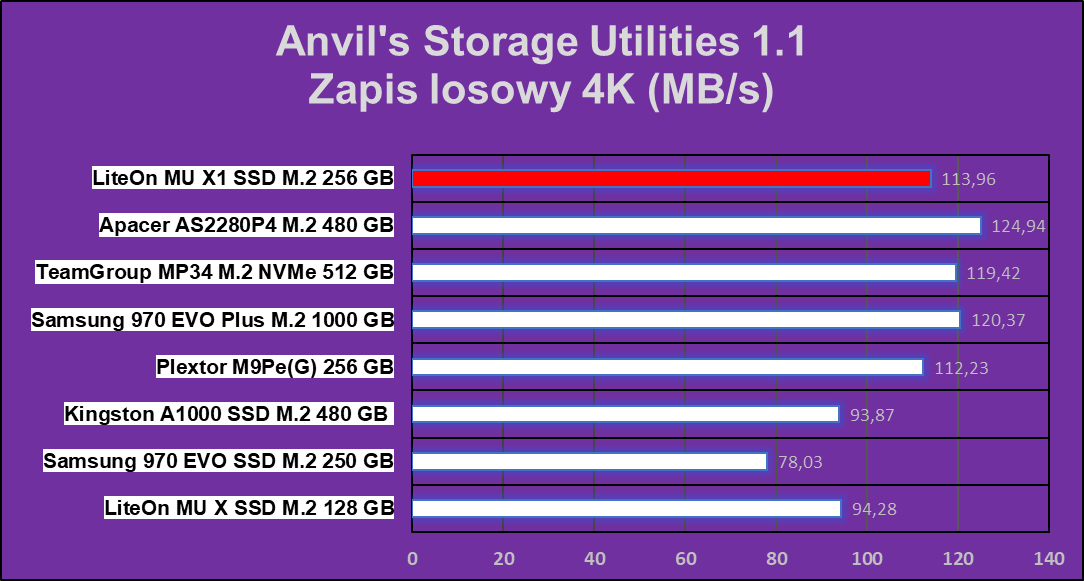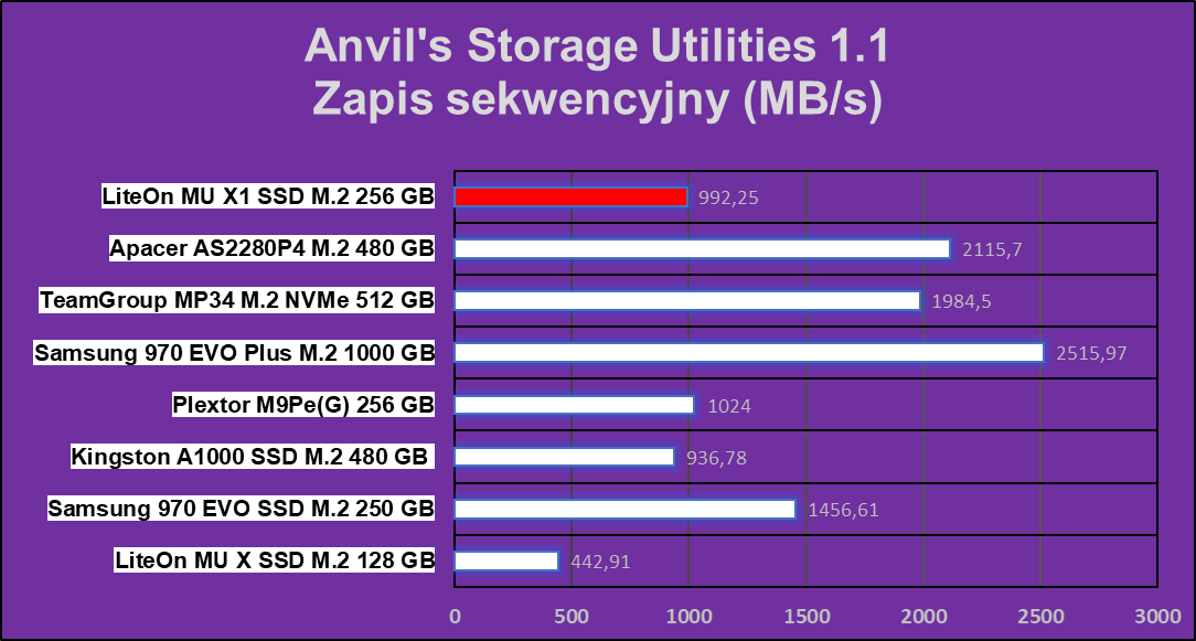W znacznie surowszym Anvil’s Strorage Utilities tylko sekwencyjny zapis spełnił oczekiwane 1000 MB/s, a odczytowi zabrakło nieco ponad 1000 MB/s. Niepokoi mnie jednak długi czas dostępu w kwestii odczytu, który jest w naszym zestawieniu rekordowy… i to nie świadczy dobrze o propozycji LiteOn. Dalsze testy pokażą jednak, czy słusznie.