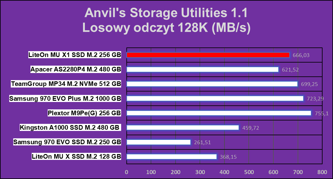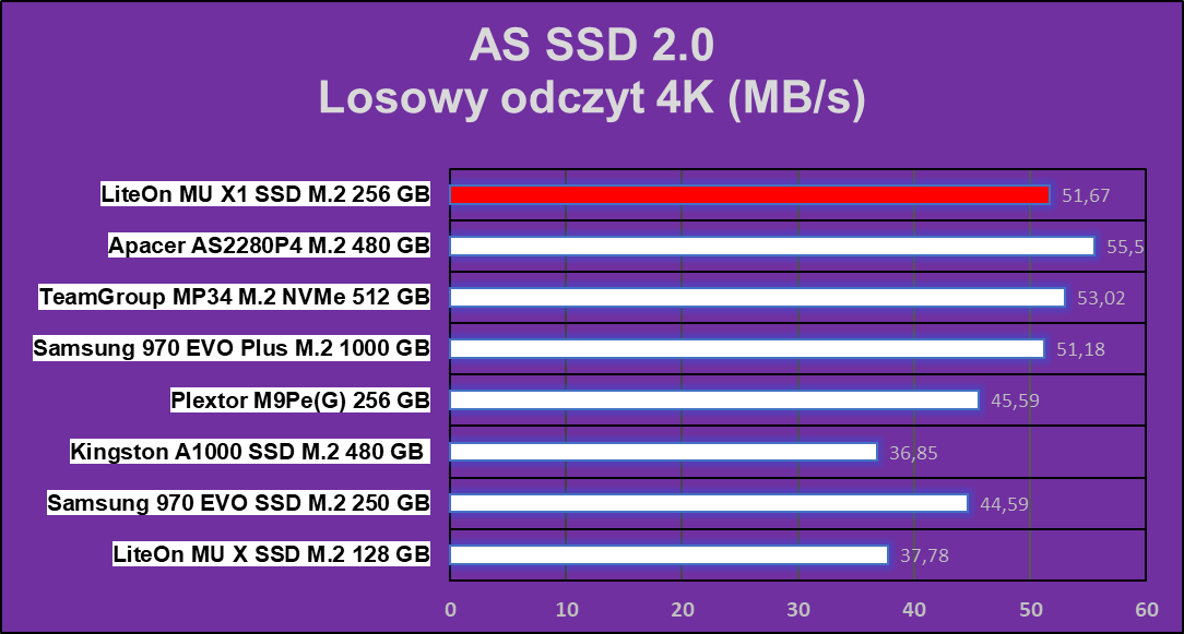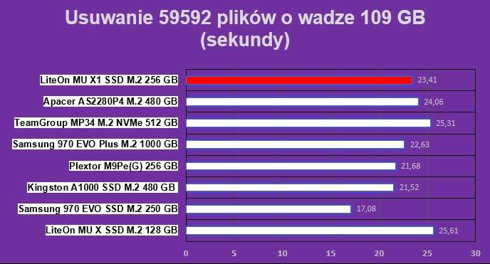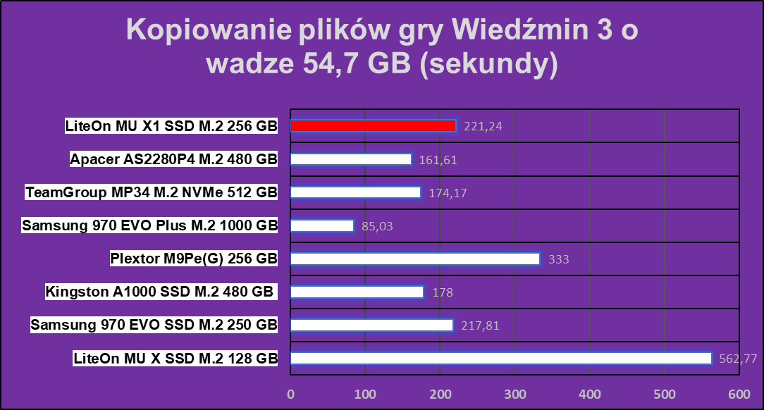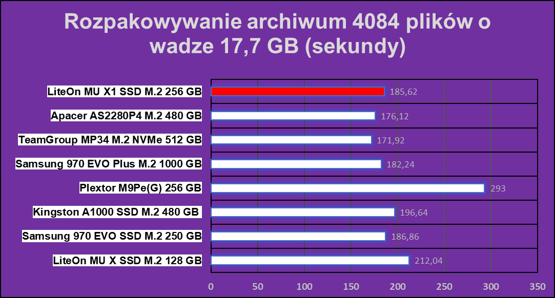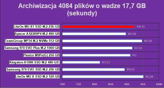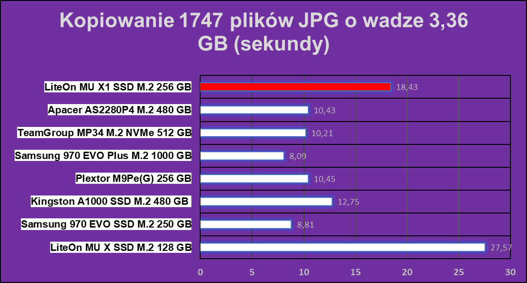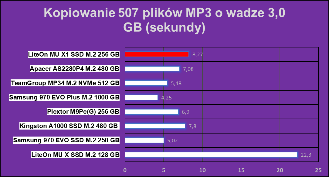 Tutaj sprawa ma się już inaczej, bo w teście z udziałem typowych działań na plikach liczy się to, jak szybko dysk poradzi sobie z wykonaniem postawionych mu zadań. Innymi słowy, im mniejszy słupek, tym lepiej. Niestety LiteOn Mu X1 w wersji 256 GB pokazuje tutaj swoje braki i choć wygrywa z MU X, to dostaje często srogie baty od konkurencji, która jest jednak od niego często droższa. Trudno więc stwierdzić, że sprawuje się kiepsko, jak na swoją cenę. Zdecydowanie widać w nim jednak problem z losowym odczytem plików, choć jego braki nie są kolosalne i opiewają głównie na kilkunastoprocentowej różnicy.