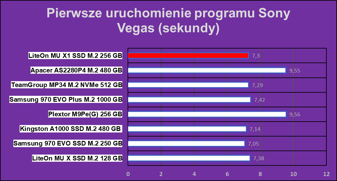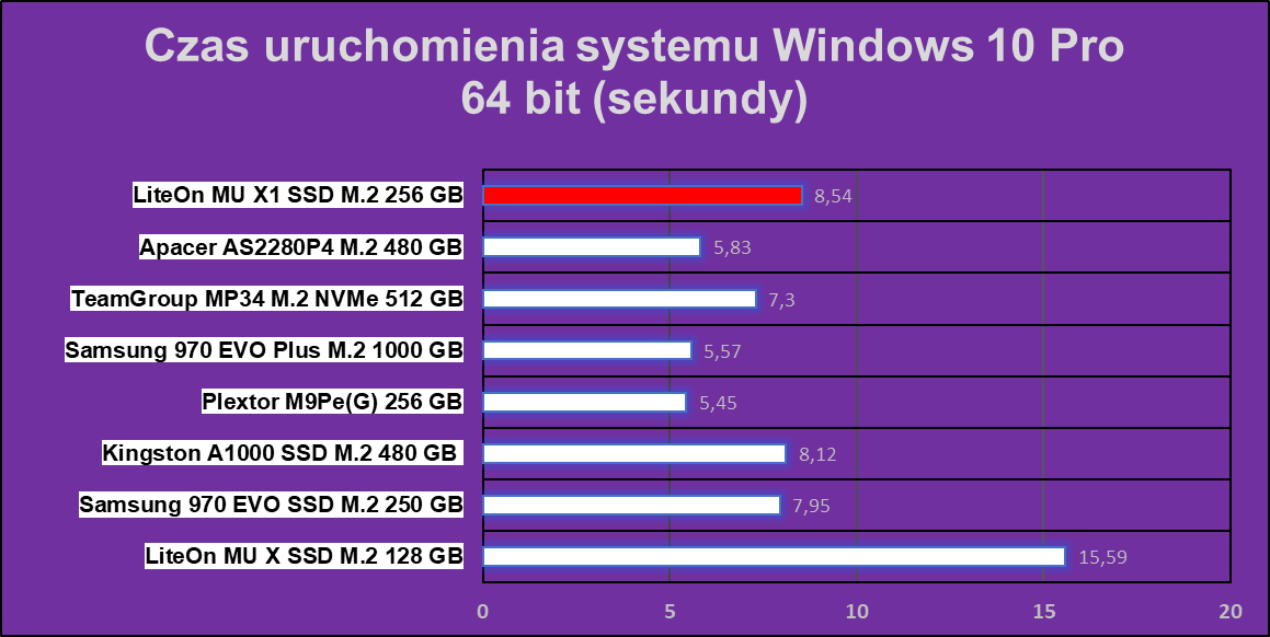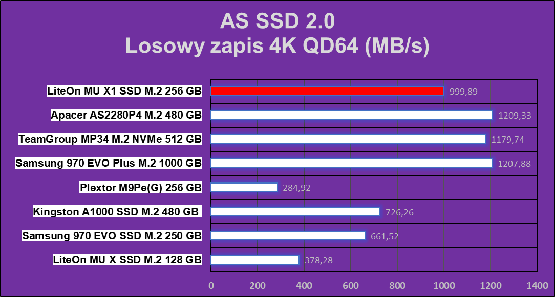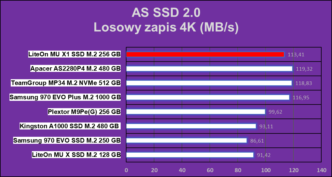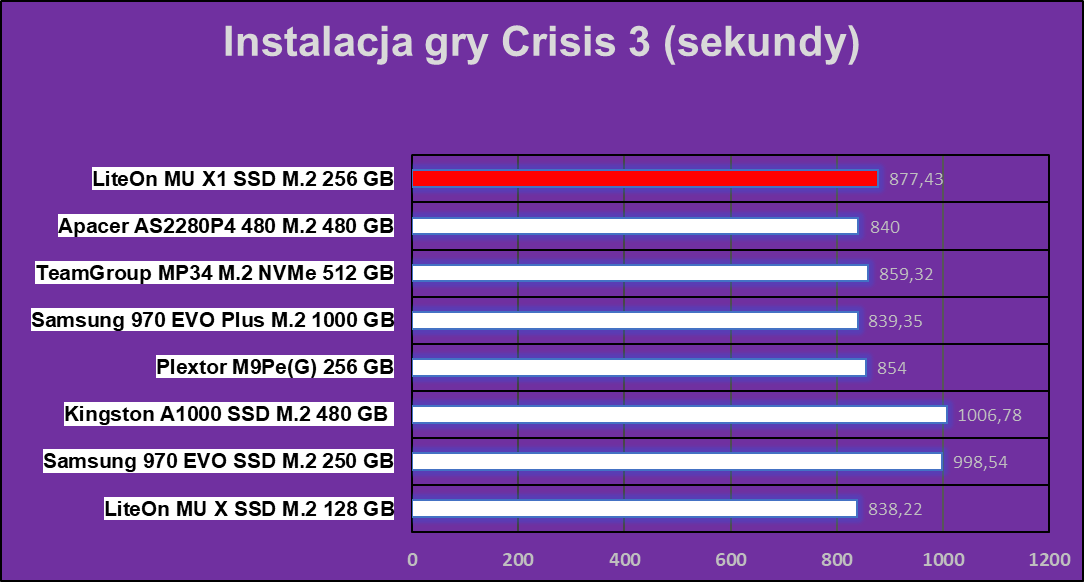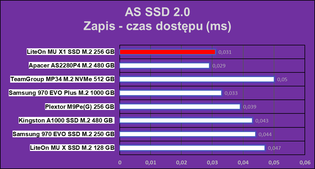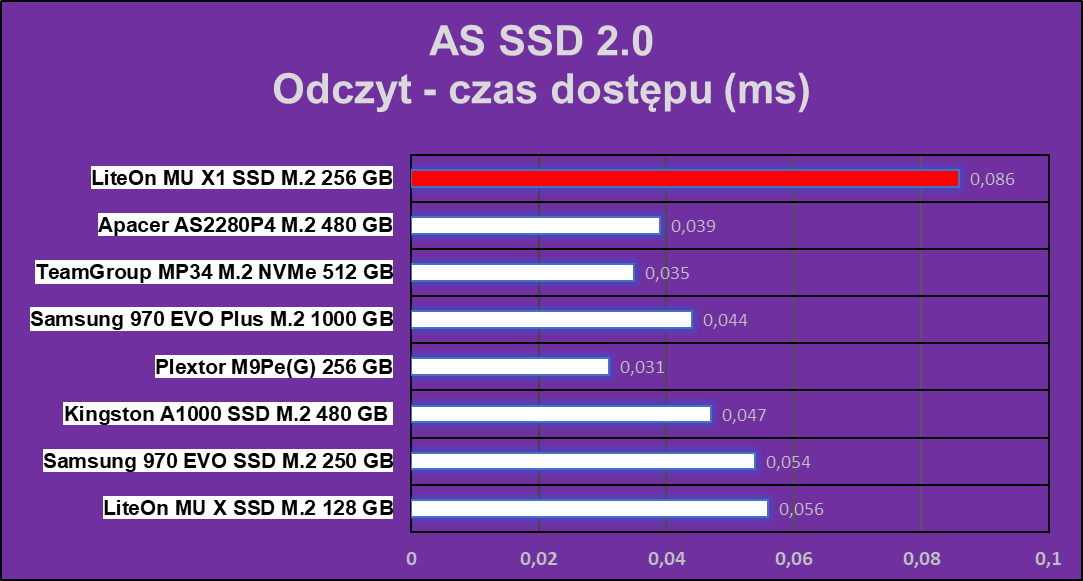Tutaj sprawa ma się już inaczej, bo w teście z udziałem typowych działań na plikach liczy się to, jak szybko dysk poradzi sobie z wykonaniem postawionych mu zadań. Innymi słowy, im mniejszy słupek, tym lepiej. Niestety LiteOn Mu X1 w wersji 256 GB pokazuje tutaj swoje braki i choć wygrywa z MU X, to dostaje często srogie baty od konkurencji, która jest jednak od niego często droższa. Trudno więc stwierdzić, że sprawuje się kiepsko, jak na swoją cenę. Zdecydowanie widać w nim jednak problem z losowym odczytem plików, choć jego braki nie są kolosalne i opiewają głównie na kilkunastoprocentowej różnicy.
