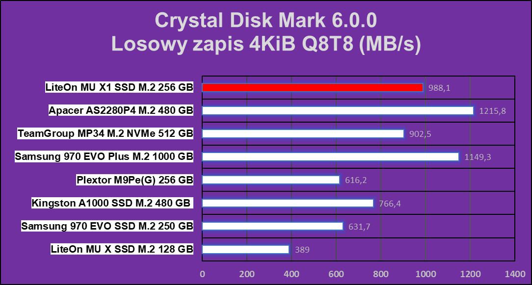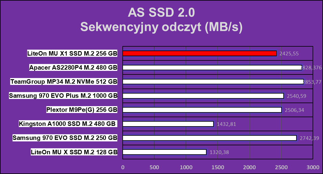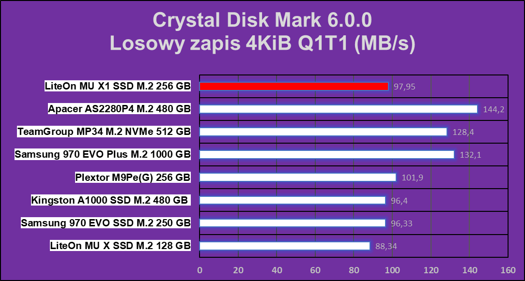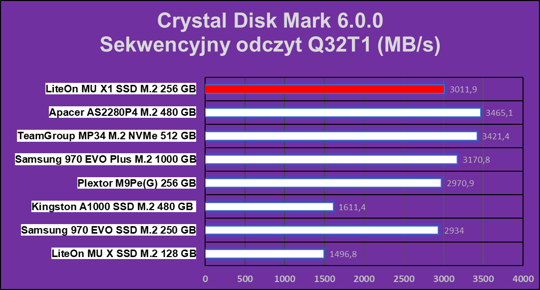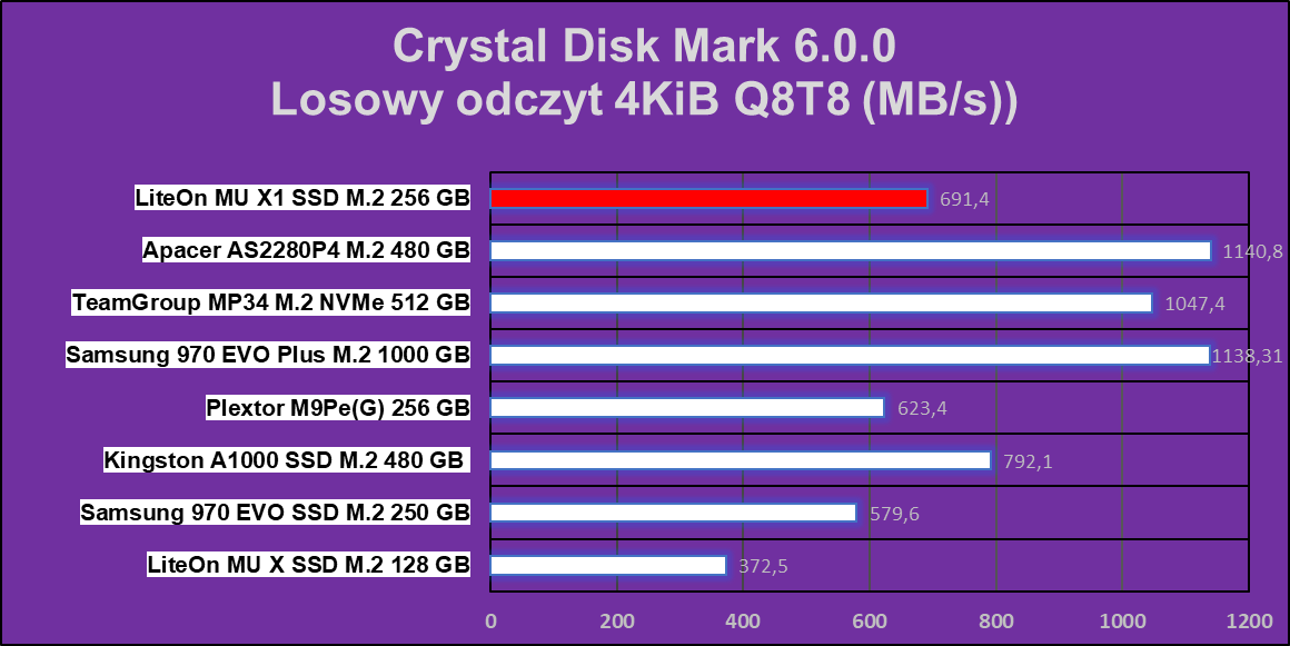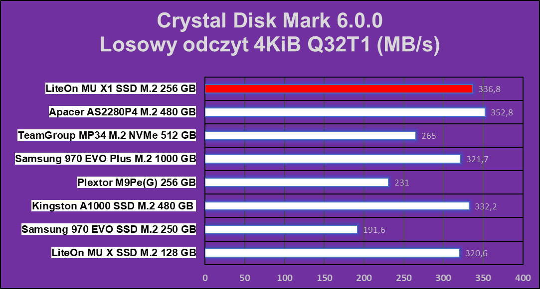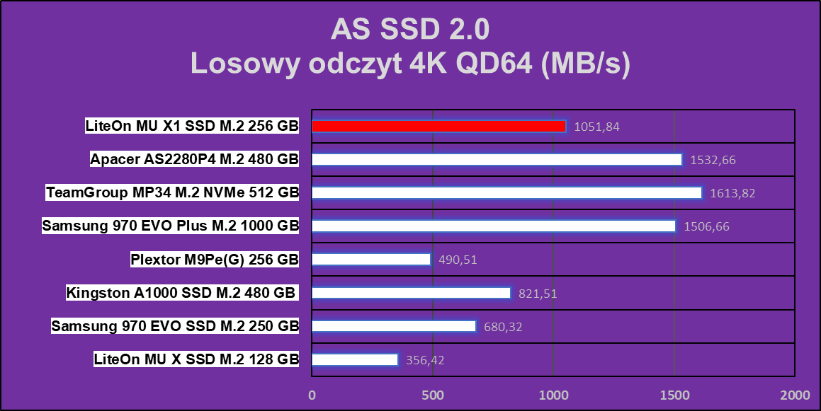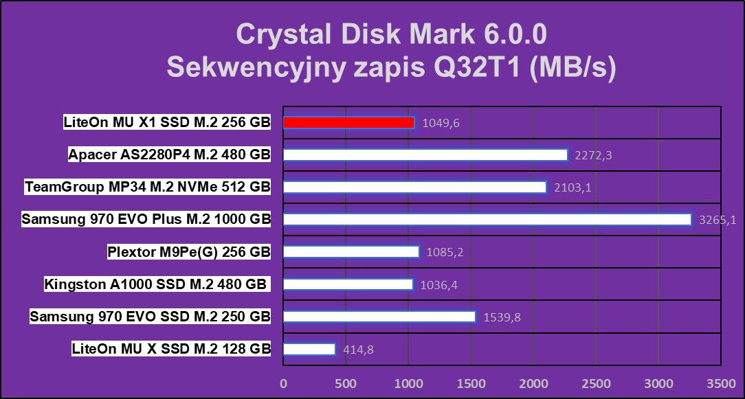 Na tradycyjny początek to, co najprostsze i najlepsze, choć niekoniecznie najbardziej miarodajne. Mowa oczywiście o testach syntetycznych, w których LiteOn MU X1 256 GB wypadł dobrze… ale tylko w teście Crystal Disk Mark, a więc w tym, który faworyzuje zdecydowanie każdy dysk.