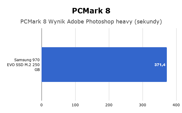 W przeciwieństwie do wcześniejszych benchmarków, PCMark 8 stara się sprawdzić wydajność dysku w nieco bardziej praktycznych zastosowaniach. Z całej masy przeprowadzanych odczytów zdecydowałem się na wybór jednych z najważniejszych. Mowa o wyniku ogólnym i transferze, na który składa się m.in. wynik w World of Warcraft, Battlefield 3, Adobe Photoshop Heavy i Microsoft Word. Niestety z powodu rozpoczęcia testowania dysków nie mogłem porównać 970 EVO do innych nośników, co postaram się poprawić w najbliższej przyszłości.