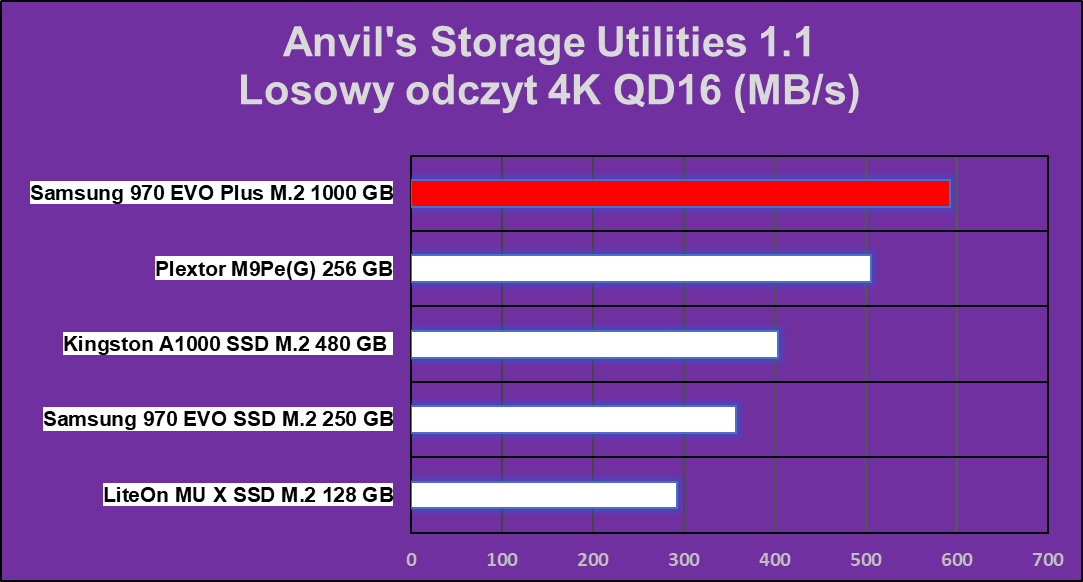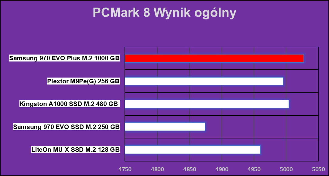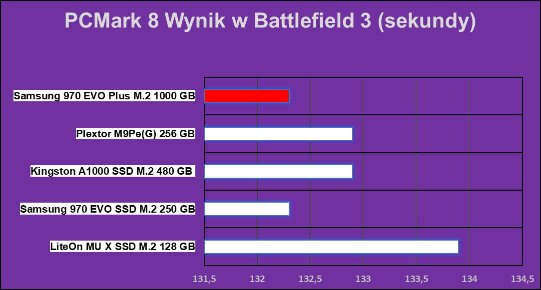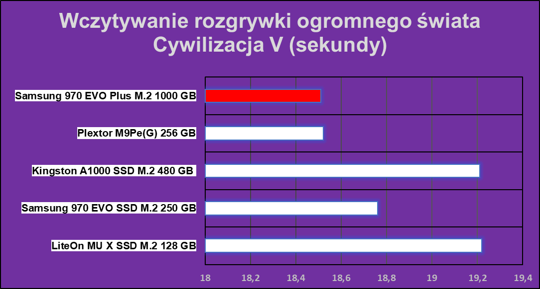 Ponownie proszę o zwrócenie uwagi na skalę, bo ta może płatać w niektórych miejscach figle. Należy tym samym pamiętać, że wynik punktowy, a sekundowy to coś zupełnie innego. W przypadku tego pierwszego im większe cyferki nabije liczba, to tym lepiej. Jednak w testach sekundowych to szybkość wykonania danego zadania ma znaczenie, więc im mniej, tym szybciej dana operacja zostaje wykonana. Na przykładzie PCMark widać, że Samsung 970 EVO Plus w 1 TB wersji niszczy doszczętnie konkurencje… szkoda tylko, że ta nie oferuje identycznej pojemności.