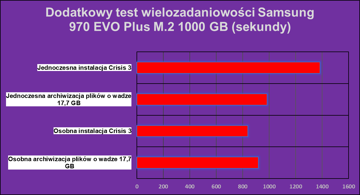 O ile operacje na plikach zniszczyły konkurencje, to 970 EVO Plus w połączeniu z grami tego nie powtórzył i finalnie okazał się lepszy tylko w instalacji gry i rozpakowywaniu archiwum.