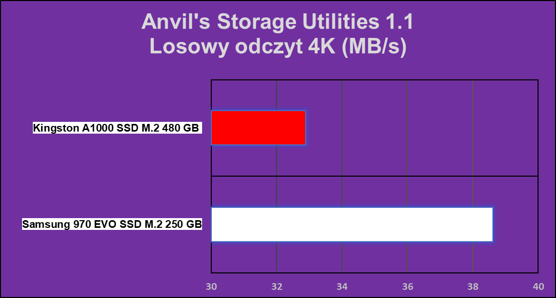 Ten z kolei test ukazuje wydajność dysku w najczęściej przeprowadzanych przez nas operacjach. Zwłaszcza kiedy na nośniku odpalamy system operacyjny. Osiągi modelu Kingston A1000 w wersji 480 GB pod tym względem są naprawdę ciekawe, bo nie tylko pokazują całkiem dobre radzenie sobie przy wykonywaniu dwóch zaawansowanych operacji, ale również łatwość, z jaką to dysk radzi sobie w przypadku archiwizacji.