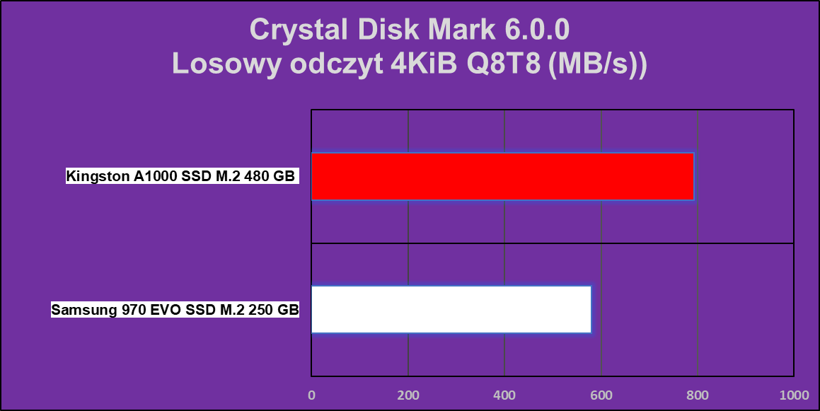 Radzę też, żebyście się nie sugerowali w wielkim stopniu porównaniem wydajności do modelu Samsung EVO 970, bo jego cena może i jest identyczna, jak w przypadku A1000, ale mówimy ciągle o 250 GB różnicy. Wersję 500 GB dorwiemy dopiero za około 840 złotych. Pokazuje to jednocześnie wydajność, za jaką jesteśmy zmuszeni wydać kolejne 300 złotych więcej. Mam jednak wrażenie, że przeprowadzone kilka miesięcy temu testy dysku Samsunga są w przypadku operacji poruszających zapis (zarówno w testach syntetycznych, jak i praktycznych) są nieco przekłamane, a źródło tego leży najprawdopodobniej w samym nośniku, który albo nie pracuje wydajnie na mojej platformie, albo jest tzw. „złą sztuką„.