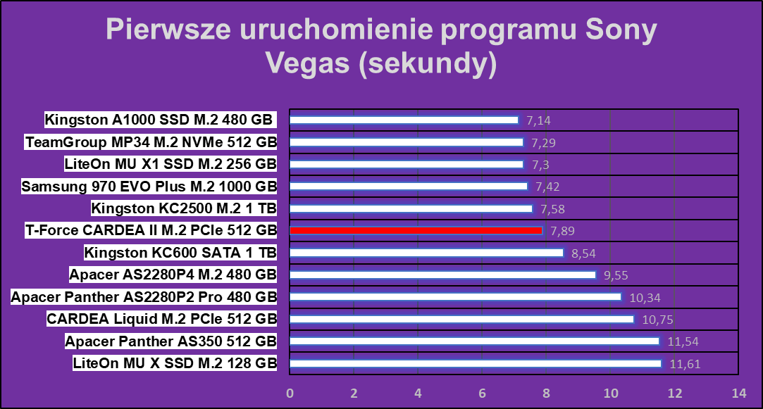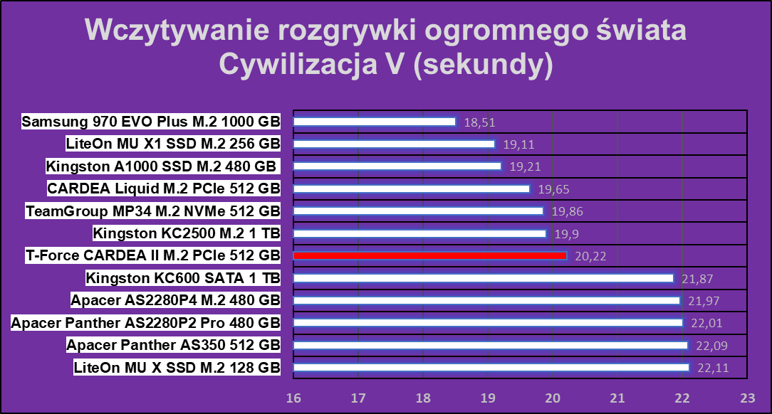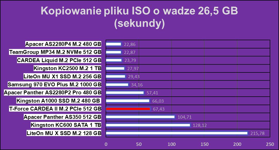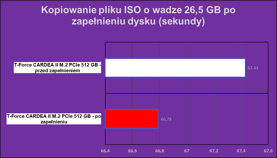Na szczęście pozorny spadek wydajności nie przekłada się znacznie na praktyczne operacje. W nich nośnik poradził sobie dobrze, bo choć czasy się nie zgrały, różnica wyniosła zaledwie części sekundy, co jak na prawie 70-sekundowe zadanie nie jest złym wynikiem.