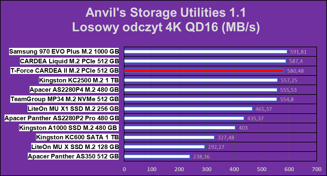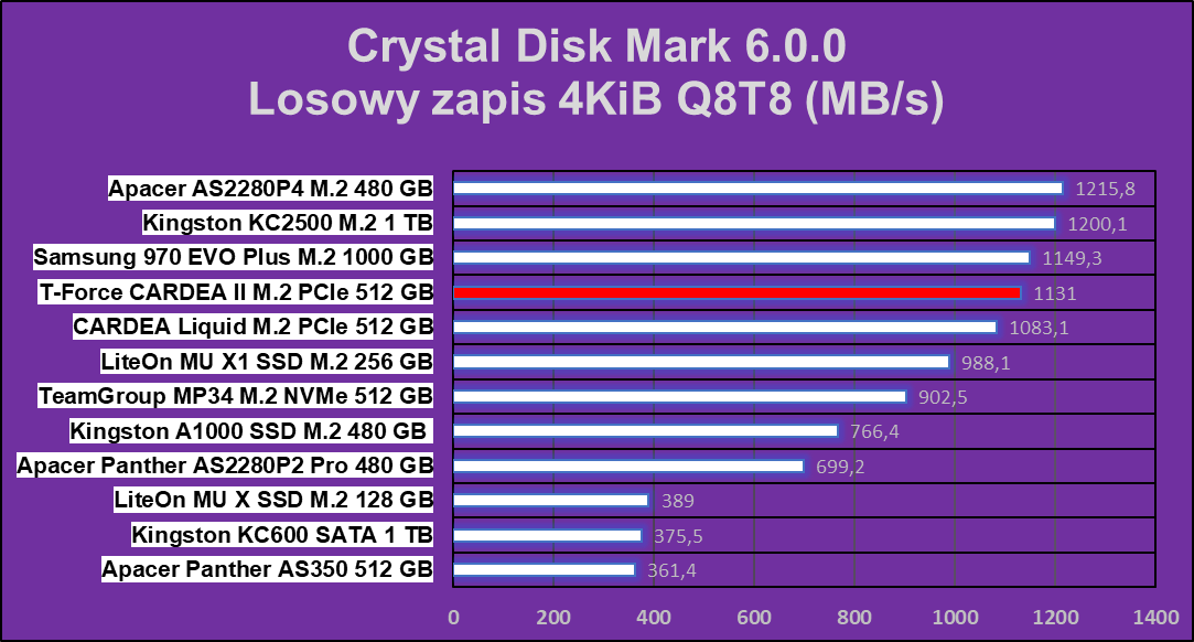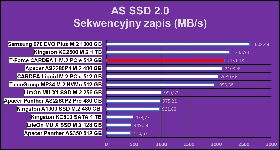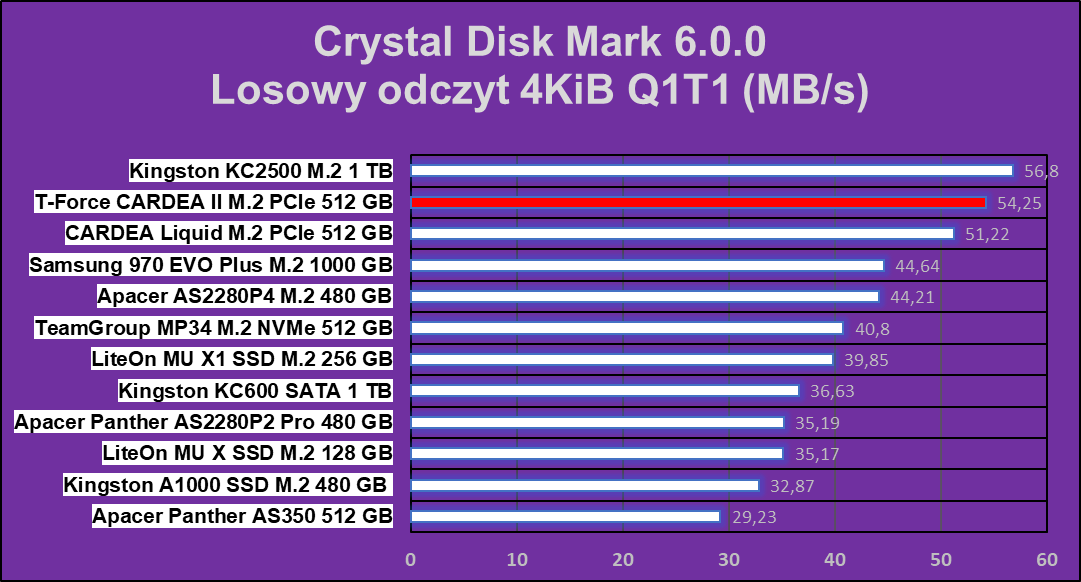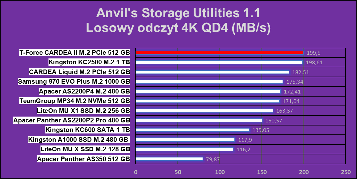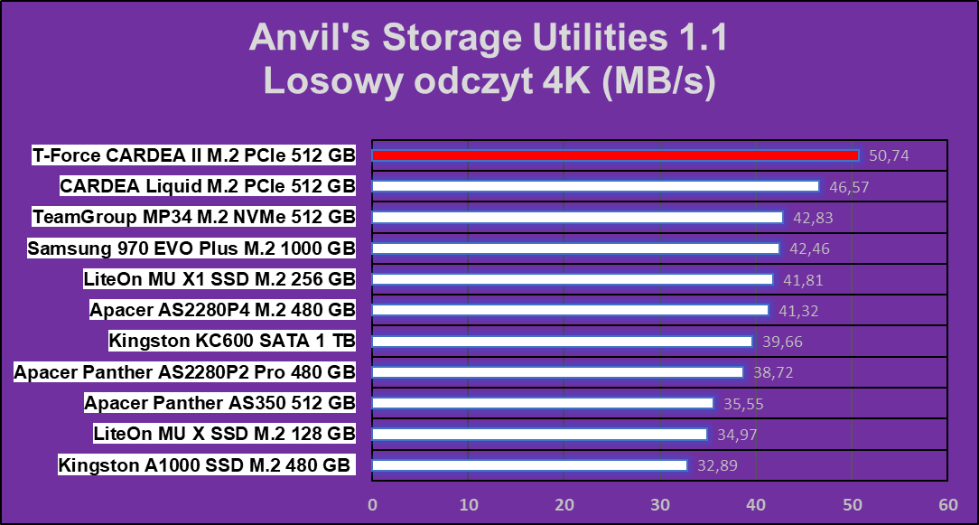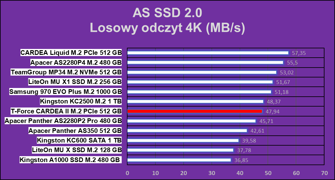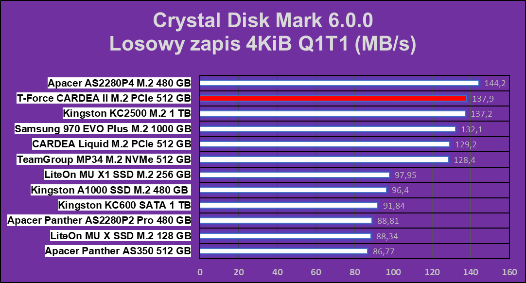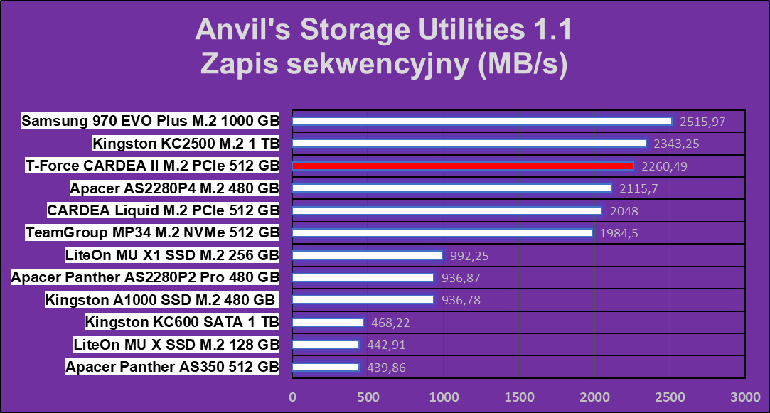 Trzy programy wykazały, że T-Force Cardea II 512 GB, to naprawdę solidny dysk, który w benchmarkach zjada nawet droższą i pojemniejszą konkurencję. Wprawdzie miał nawet trzy momenty zwątpienia, ale może być to równie dobrze jakaś anomalia. W skrócie jednak – jest nieźle.